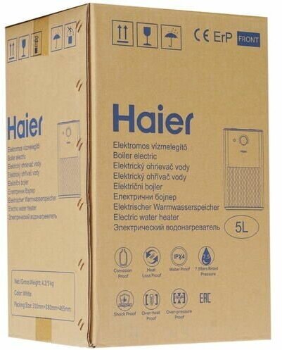 Накопительный водонагреватель Haier EC5U(EU) объёмом 5 литров — отличный вариант на небольшую кухню или в ванную. В случае отключения воды он даст возможность помыть посуду, умыться или даже быстро принять душ. Компактные размеры и современный дизайн позволяют смонтировать водонагреватель в любом удобном месте рядом с раковиной. Водонагреватель прослужит максимально долго — стальной бак внутри имеет трехслойное защитное покрытие против коррозии. Внутренний слой — специальная износостойкая эмаль. ТЭН из высококачественной нержавеющей стали, у него высокий тепловой КПД и повышенный ресурс работы. Дополнительно более длительный срок службы водонагревателя обеспечивает увеличенный магниевый анод, нивелирующий процессы коррозии. Максимально продумана безопасность: технология Shock Proof защищает пользователя в случае утечки тока, исключён перегрев водонагревателя или нагрев без воды. Реализована и защита от образования избыточного давления в баке.