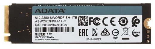 SSD M.2 накопитель A-Data Swordfish [] 1 ТБ порадует вас своим высоким качеством и отличными характеристиками. В нем применяется тип памяти TLC 3D NAND. При изготовлении компания использовала только проверенные компоненты. Накопитель относится к форм-фактору 2280. Необходимо обратить внимание на этот параметр при покупке. Подключение происходитерез разъем M.2. Интерфейс – PCIe Gen3x4, он гарантирует высокую пропускную способность. Скорость записи составляет 1200 МБ/с,тения – до 1800 МБ/с. На практике эти цифры обеспечивают увеличение быстродействия ПК. Приложения запускаются в течение нескольких секунд, а операционная система загружается значительно быстрее. Объем памяти – 1 ТБ. Многим пользователям этого окажется достаточно. Нельзя не отметить высокую надежность накопителя. Среднее время между отказами – 1, 8 миллионаасов, он прослужит вам очень долго. Накопитель A-Data Swordfish [] 1 ТБ переносит существенные перегрузки до 1500 G, стойко выдержит все