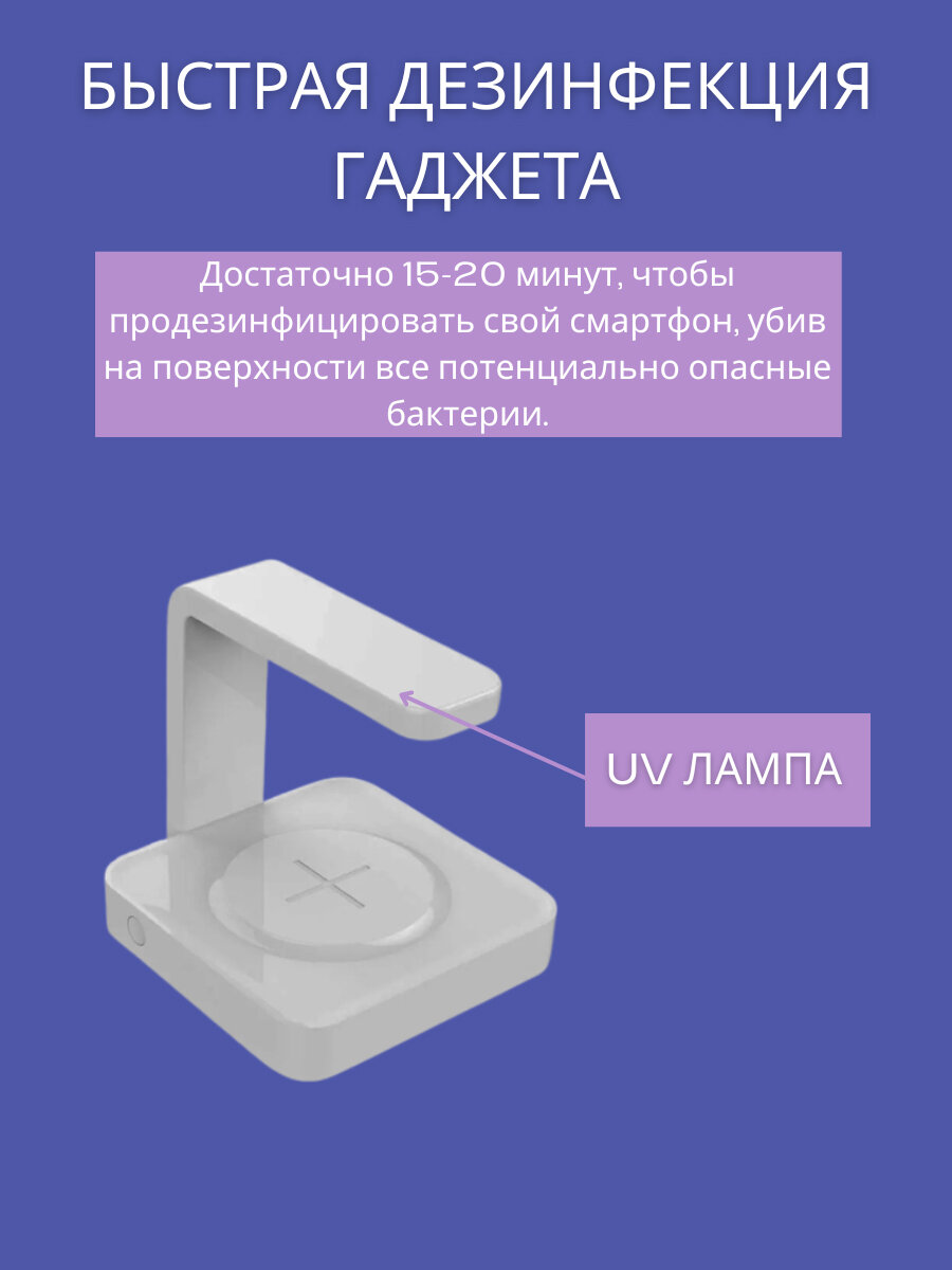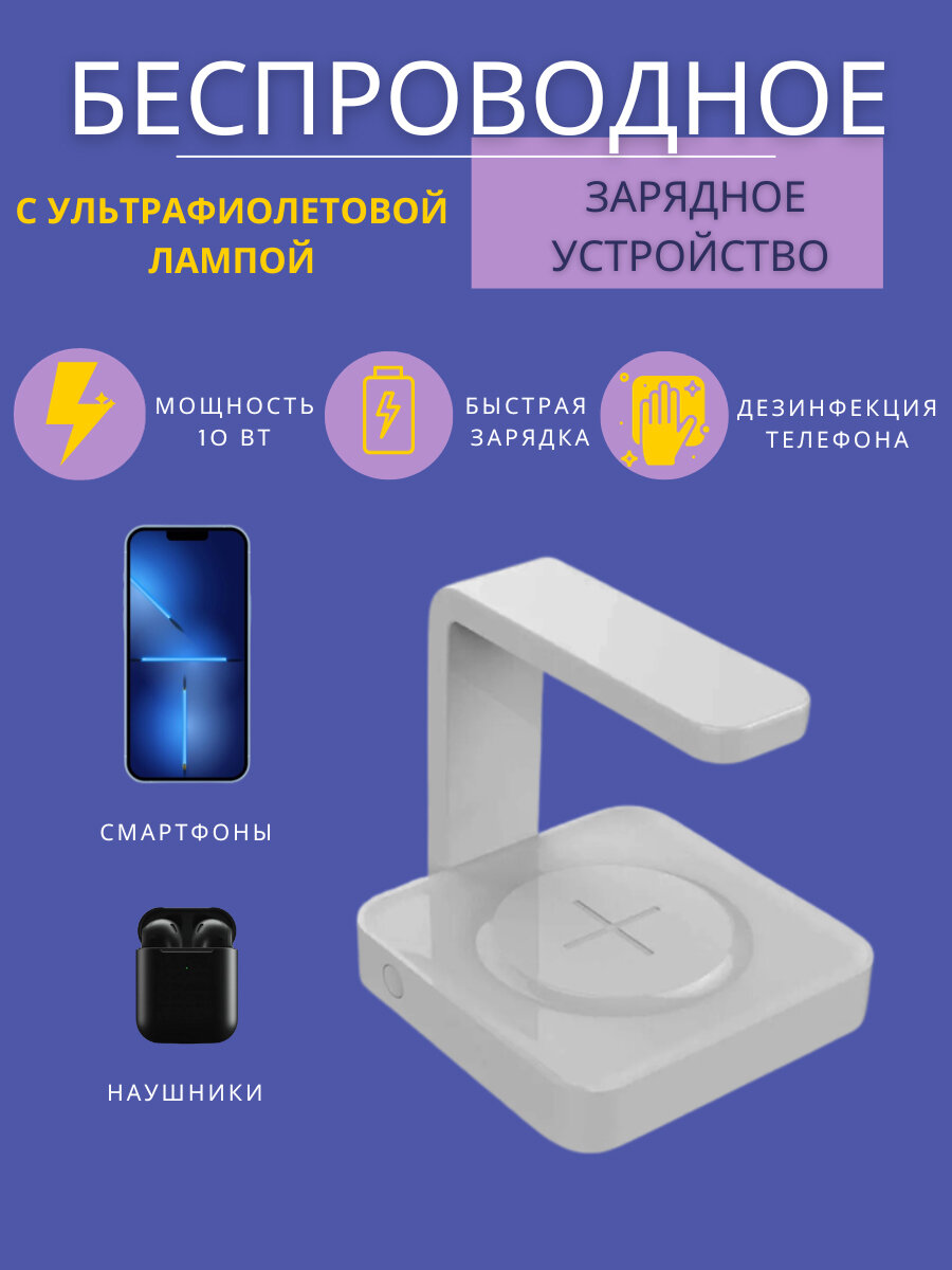 Беспроводное зарядное устройство Everstone предназначено для быстрой зарядки вашего смартфона. Мощность беспроводной зарядки достигает 10 Вт. Также возможна проводная зарядка еще одного устройства, для этого предусмотрен USB-выход. Встроенная ультрафиолетовая лампа.