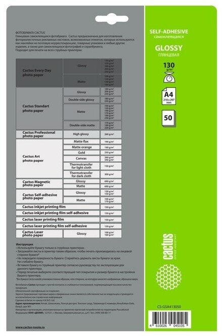 Фотобумага Cactus A4/130г/м2/50л. глянцевое самоклей. для струйной печати