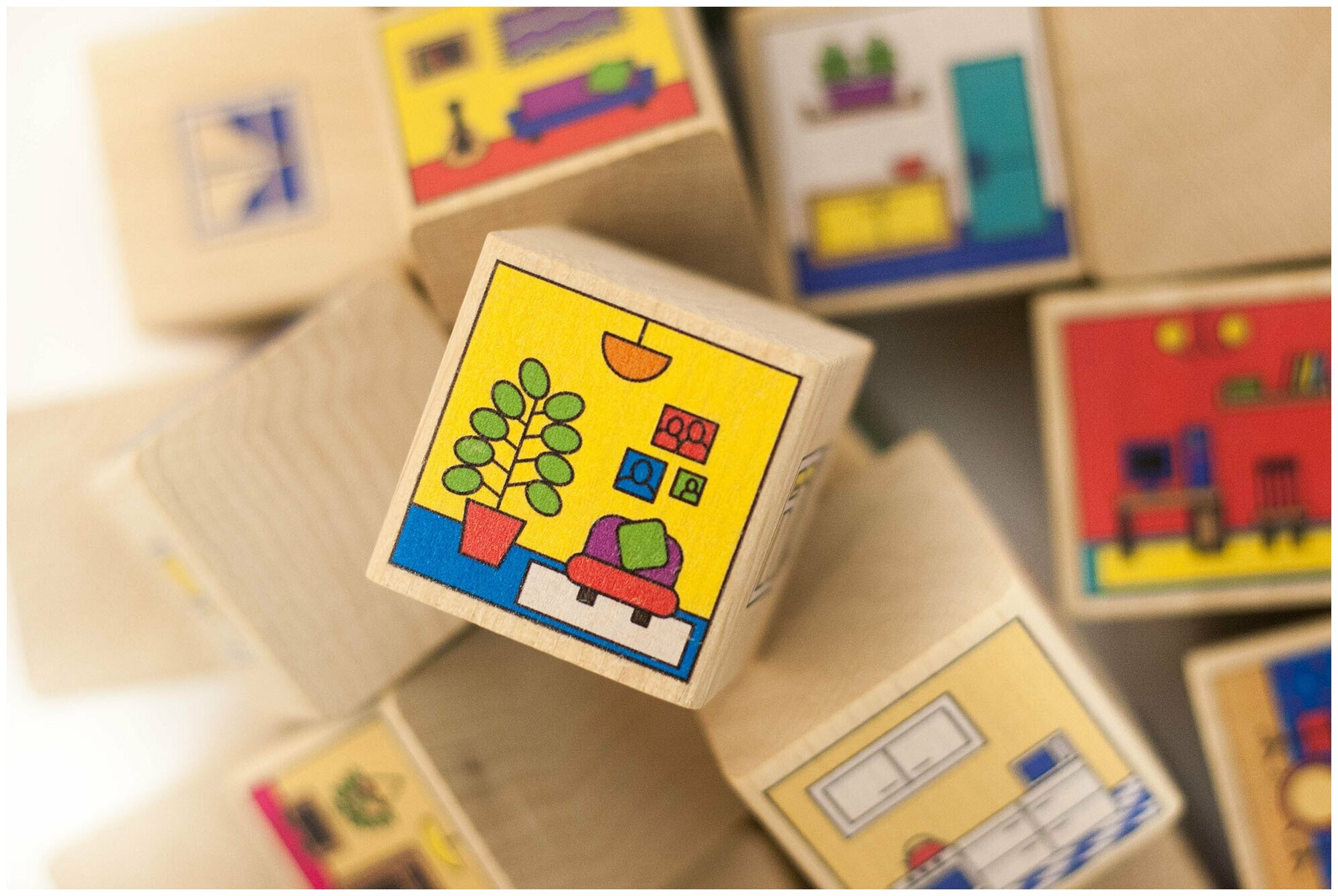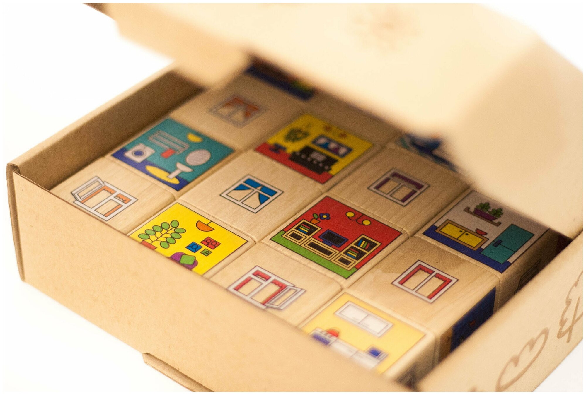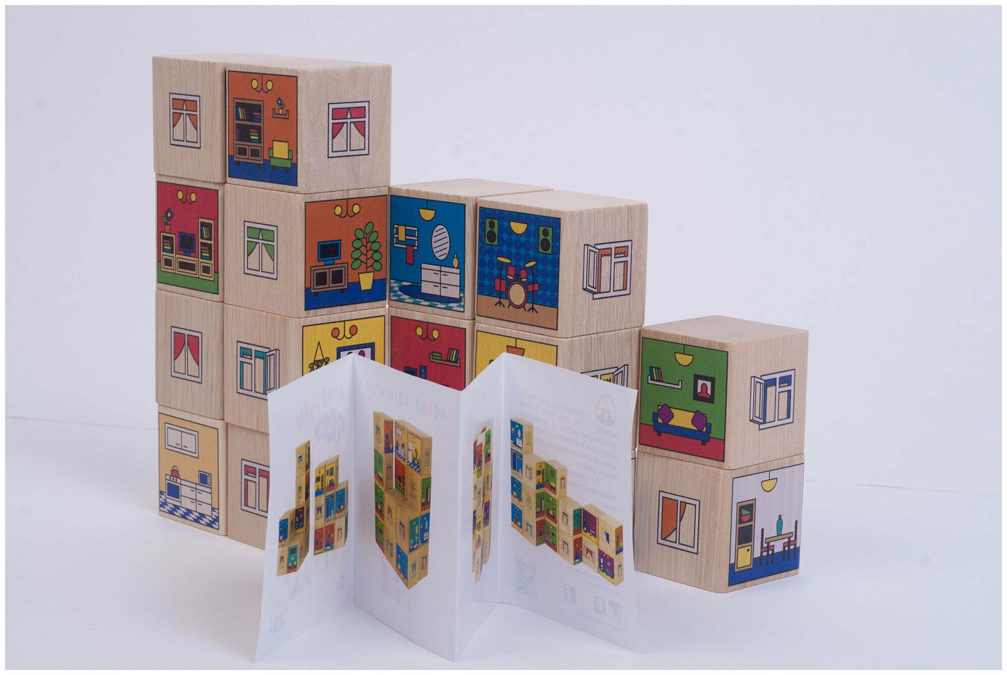 16 кубиков набора открывают возможности для конструирования детьми новых домов разной этажности с изображением их внутреннего устройства.