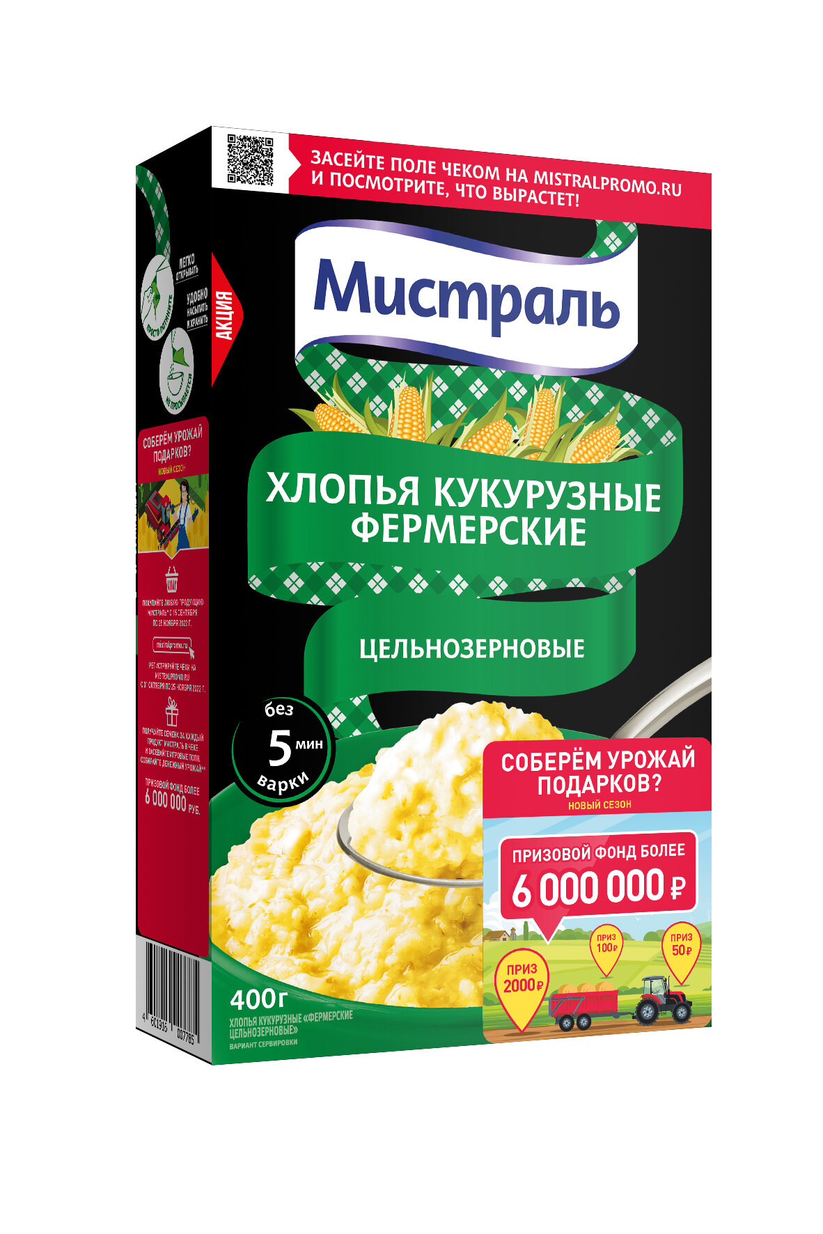 О товаре Хлопья Мистраль Фермерские кукурузные 400г – идеальное решение для быстрого, вкусного и полезного завтрака для всей семьи. В состав входят исключительно цельные кукурузные зерна, выращенные на экологически чистых полях России без применения вредных химических удобрений. Кукуруза – древнейшее злаковое растение, которое в настоящее время по продаваемости уступает только пшенице. Ее яркие желтые зерна богаты витаминами группы В, калием, фосфором, магнием и клетчаткой. Порция кукурузной каши, съеденная ранним утром, обеспечит вам заряд энергии и отличное настроение на весь день, улучшит пищеварение, подарит длительное чувство насыщения, поможет укрепить иммунитет. Продукция ТМ «Мистраль» отличается стабильно высоким качеством, существенно превышающим стандарты ГОСТ. Все сырье проверяется в лаборатории и проходит многоступенчатую очистку. Без ГМО.