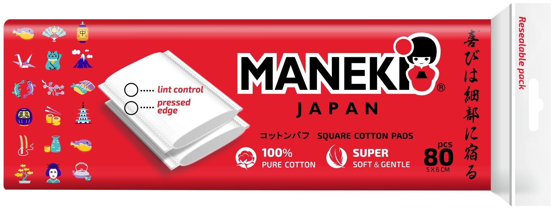 Подушечки ватные косметические Maneki Square Cotton Pads 80шт. (CP1163)