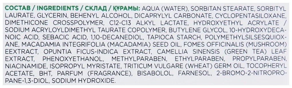 | Состав | вода, сорбитанстеарат, сорбитиллаурат, глицерин, бегениловый спирт, дикаприлилкарбонат, циклопентасилоксан, кроссполимер диметикона, С12-С13 алкиллактат, сополимер гидроксиэтилакрилата / акрилоилдиметилтаурата натрия, бутиленгликоль, 10-гидроксидекановая кислота, себациновая кислота, 1,10-декандиол, крахмал тапиоки, полиметилсилсесквиоксан, масло семян Macadamia Integrifolia (макадамии), экстракт Fomes Officinalis (древесного гриба), экстракт Opuntia Ficus-Indica (индейской опунции), экстракт Camellia Sinensis (зеленого чая), феноксиэтанол, метилпарабен, этилпарабен, пропилпарабен, ниацинамид (витамин РР), изопропилмиристат, масло зародышей Triticum vulgare (пшеницы), токоферилацетат, БГТ, парфюмерная композиция, бисаболол, фарнезол, 2-бром-2-нитропропан-1,3-диол, гидроксид натрия |