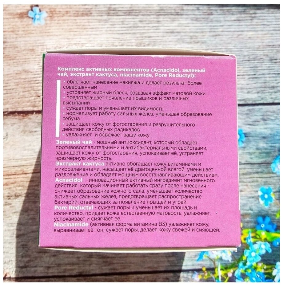 Крем-праймер Bielita Pure Green ухаживает за вашей кожей и преображает её: заполняет неровности кожи, фиксирует макияж, создавая эффект идеальной кожи.Комплекс активных компонентов (Acnacidol, зеленый чай, экстракт кактуса,niacinamide,PoreReductyl):облегчает нанесение макияжа и делает результат более совершеннымустраняет жирный блеск, создавая эффект матовой кожипредотвращает появление прыщиков и различных высыпанийсужает поры уменьшает их видимостьнормализует работу сальных желез, уменьшая образование себумазащищает кожу от фотостарения и разрушительного действия свободных радикаловувлажняет и освежает вашу кожуЗеленый чай- мощный антиоксидант, который обладает противовоспалительными и антибактериальными свойствами, защищает кожу от фотостарения, успокаивает её, устраняет чрезмерную жирность.Экстракт кактуса активно обогащает кожу витаминами и микроэлементами, насыщает её драгоценной влагой, уменьшает раздражение и обладает мощным восстанавливающим действием.Acnacidol -инновационный активный ингредиент мгновенного действия, который начинает работать сразу после нанесения - снижает образование кожного сала, уменьшает количество активных сальных желез, предотвращает распространение бактерий, отвечающих за появление прыщей и угрей.PoreReductyl-сужает поры и уменьшает их площадь и количество, придает коже естественную матовость, увлажняет, успокаивает и смягчает ее.Niacinamide(активная форма витамина В3) увлажняет кожу, выравнивает её тон, сужает поры, делает кожу свежей и сияющей.