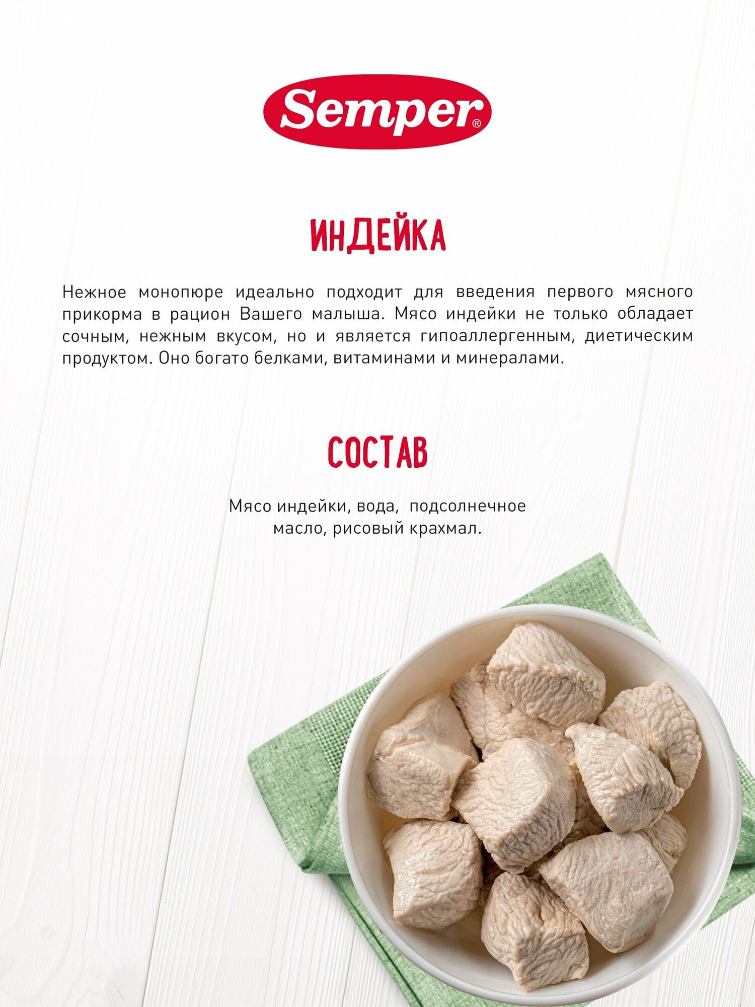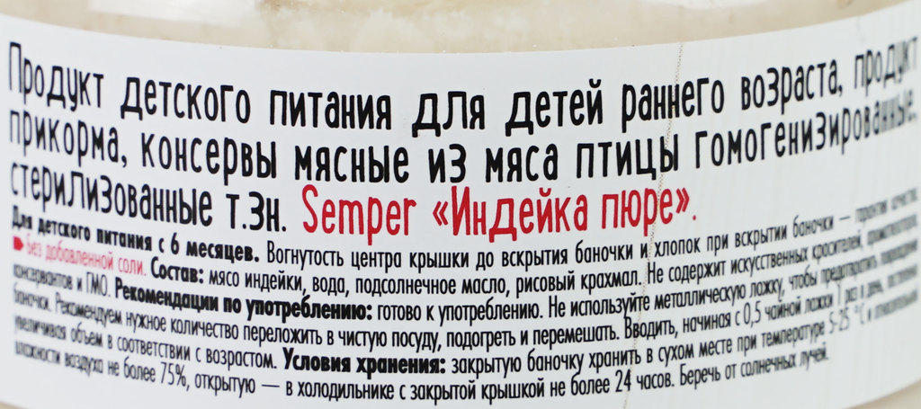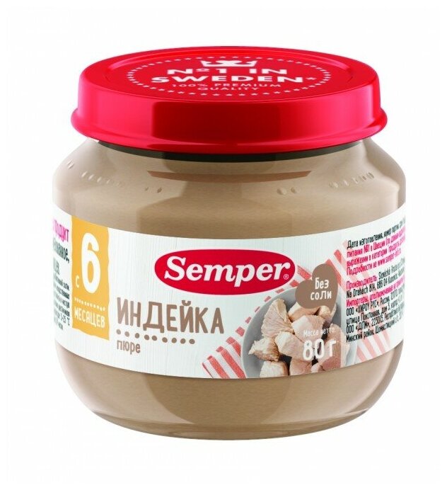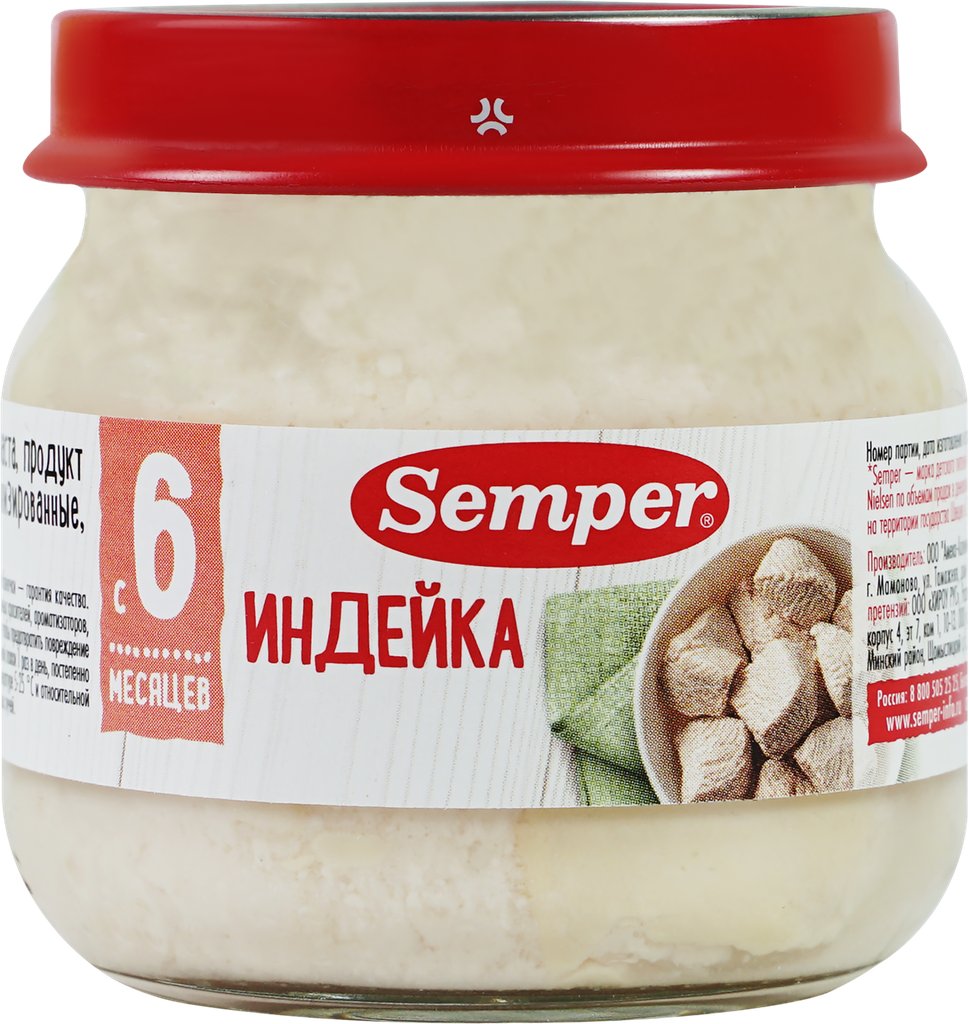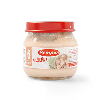 Semper Пюре Индейка с 6 мес. 80 г Нежные и воздушные мясные монопюре Semper упакованы в маленькие баночки по 80 граммов и идеально подходят для введения мясного прикорма в рацион малыша. Пюре гомогенизированное, то есть по консистенции оно не отличается от уже привычных для ребёнка овощных пюре. Мясо индейки не только обладает сочным, нежным вкусом, но и является гипоаллергенным, диетическим продуктом, который подойдёт малышам, предрасположенным к аллергии. Оно богато белками, витаминами и минералами. Железо из мяса индейки легко усваивается и является прекрасной профилактикой железодефицитной анемии у детей.