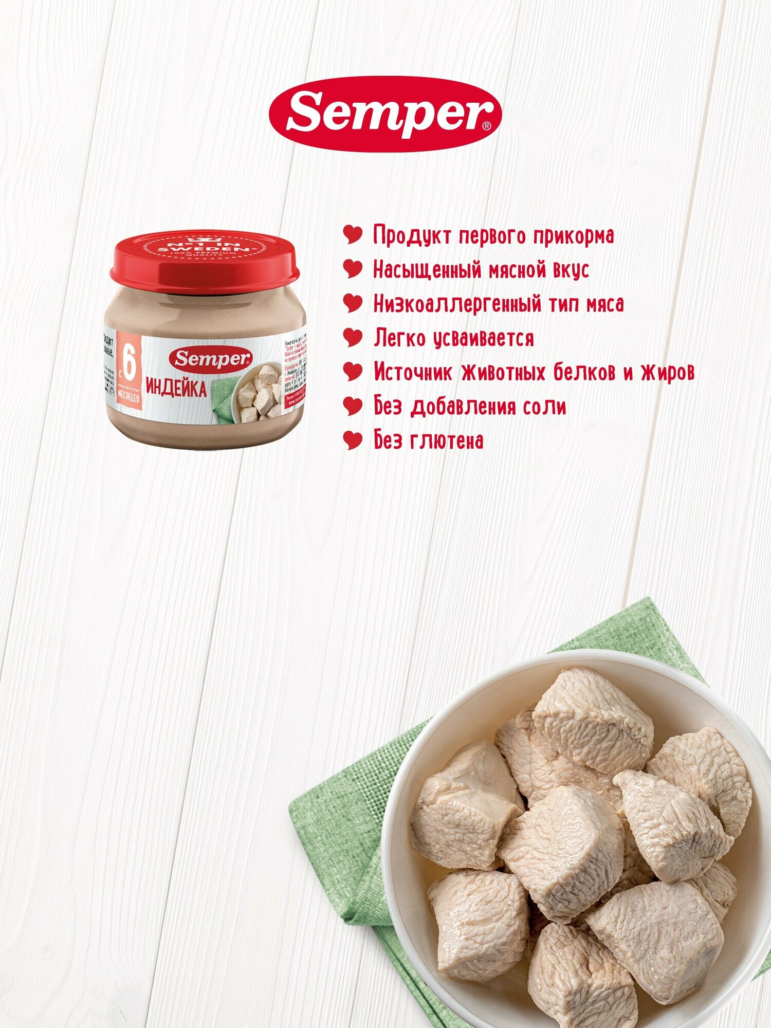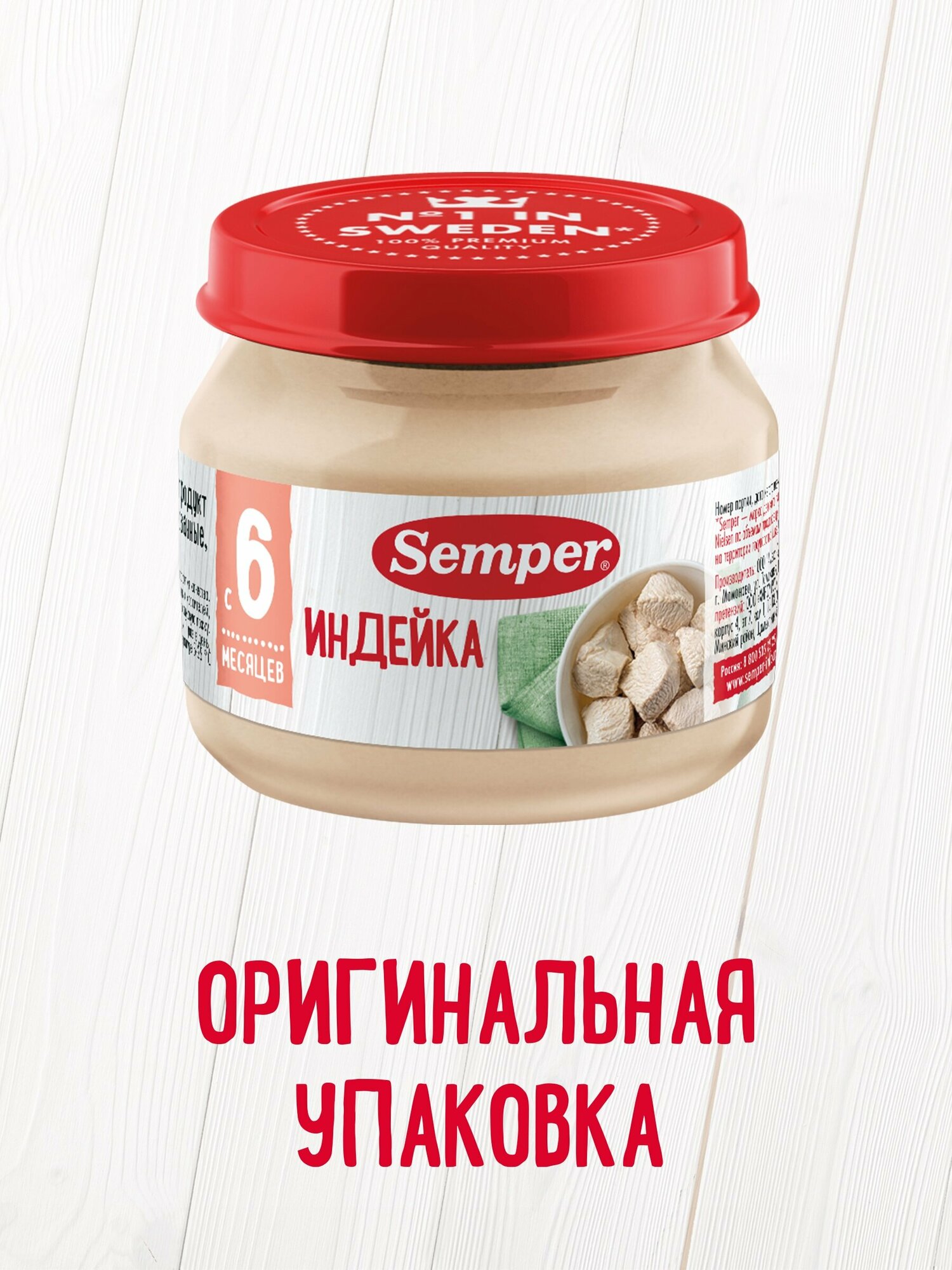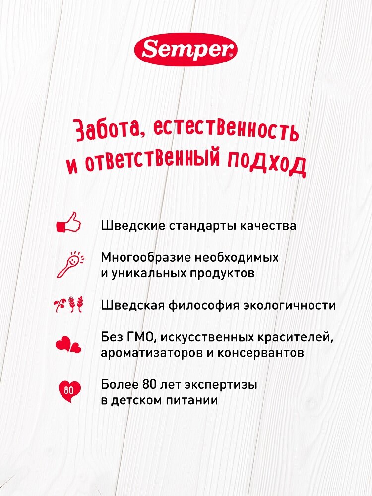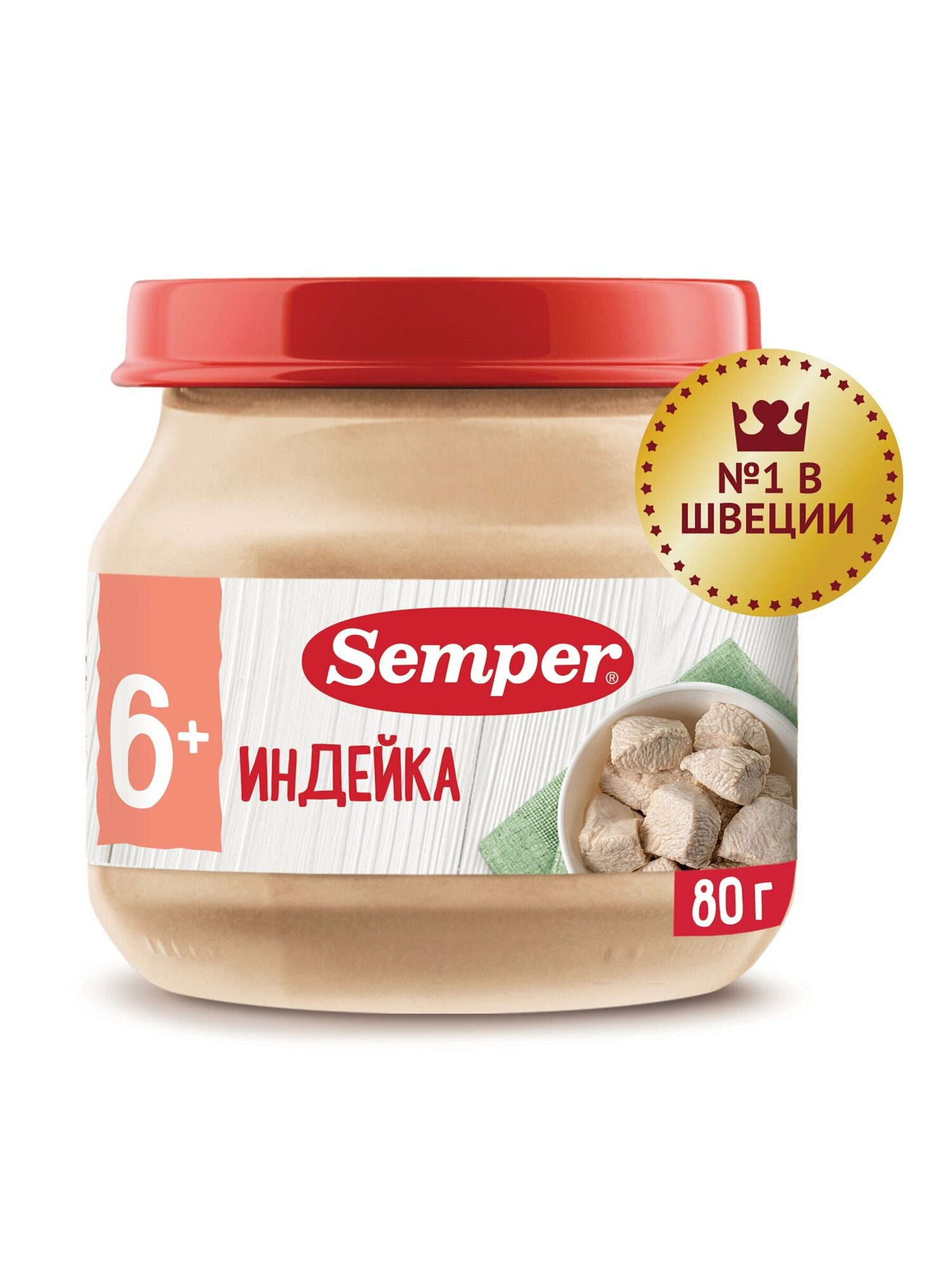 Semper Пюре Индейка с 6 мес. 80 г Нежные и воздушные мясные монопюре Semper упакованы в маленькие баночки по 80 граммов и идеально подходят для введения мясного прикорма в рацион малыша. Пюре гомогенизированное, то есть по консистенции оно не отличается от уже привычных для ребёнка овощных пюре. Мясо индейки не только обладает сочным, нежным вкусом, но и является гипоаллергенным, диетическим продуктом, который подойдёт малышам, предрасположенным к аллергии. Оно богато белками, витаминами и минералами. Железо из мяса индейки легко усваивается и является прекрасной профилактикой железодефицитной анемии у детей.