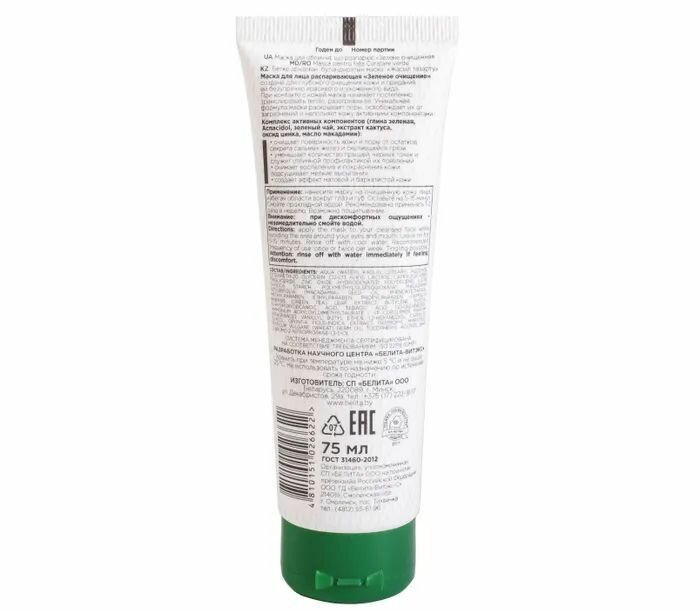 | Состав | вода, каолин, цетеариловый спирт, цетеарет-20, глицерин, оксид цинка, глицерилтрикаприлат/капрат, С12-С13 алкиллактат, цетеариловый спирт, гидрогенизированный полидецен, глина зеленая, крахмал тапиоки, полиметилсилсесквиоксан, экстракт Camellia Sinensis (зеленого чая), феноксиэтанол, метилпарабен, этилпарабен, пропилпарабен, масло семян Macadamia Integrifolia (макадамии), бутиленгликоль, 10-гидроксидекановая кислота, себациновая кислота, 1,10-декандиол, сополимер винилпирролидона и акрилоилдиметилтаурата аммония, парфюмерная композиция, ванилилбутиловый эфир, 1,2-гександиол, каприлилгликоль, изопропилмиристат, масло зародышей Triticum vulgare (пшеницы), токоферилацетат, БГТ, экстракт Opuntia Ficus-Indica (индейской опунции), кислота лимонная, 2-бром-2-нитропропан-1,3-диол |
