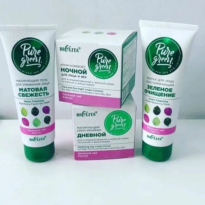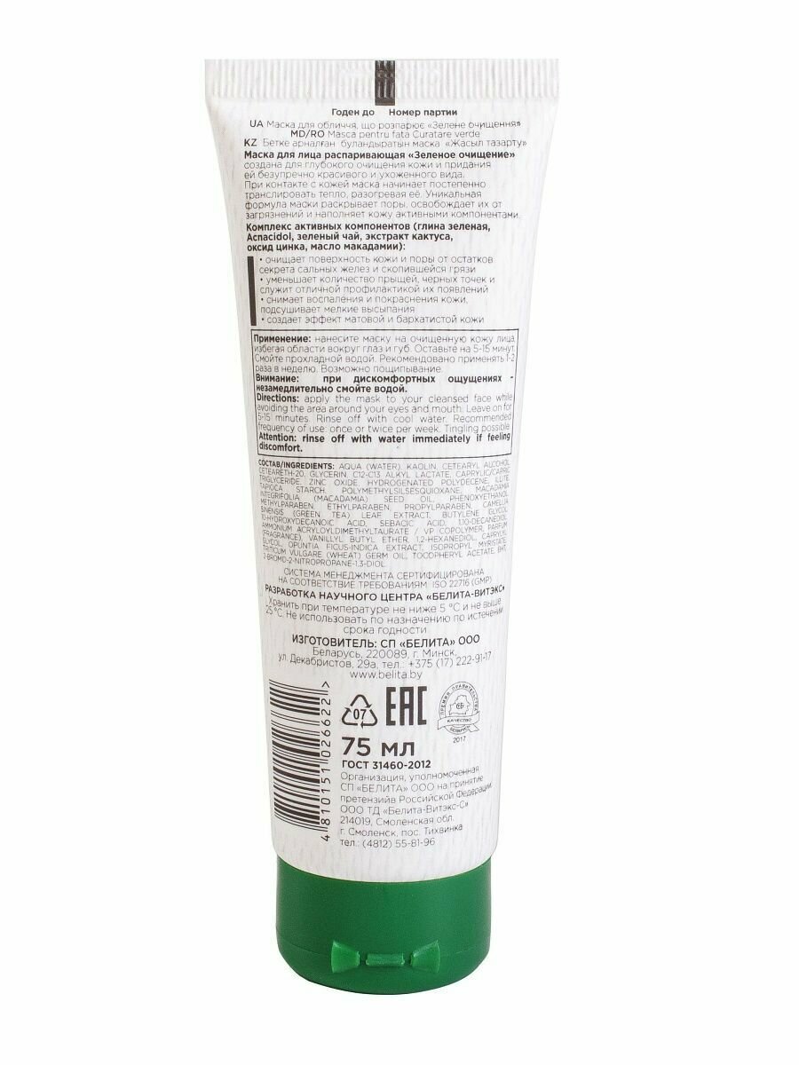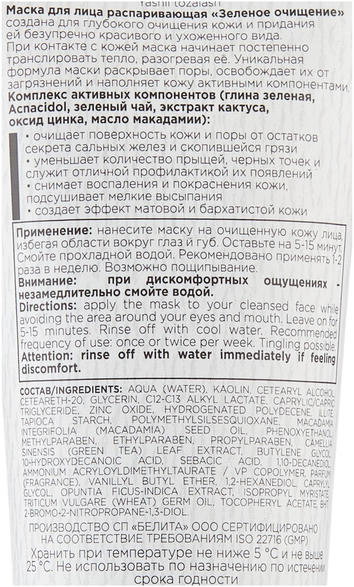 Маска для лица Bielita Pure Green создана для глубокого очищения кожи и придания ей безупречно красивого и ухоженного вида. При контакте с кожей маска начинает постепенно транслировать тепло, разогревая её. Уникальная формула маски раскрывает поры, освобождает их от загрязнений и наполняет кожу активными компонентами.Комплекс активных компонентов (глина зеленая, Acnacidol, зеленый чай, экстракт кактуса, оксид цинка, масло макадамии):очищает поверхность кожи и поры от остатков секрета сальных желез и скопившейся грязиуменьшает количество прыщей, черных точек и служит отличной профилактикой их появленийснимает воспаления и покраснения кожи, подсушивает мелкие высыпаниясоздает эффект матовой и бархатистой кожиЗеленый чай - мощный антиоксидант, который обладает противовоспалительными и антибактер