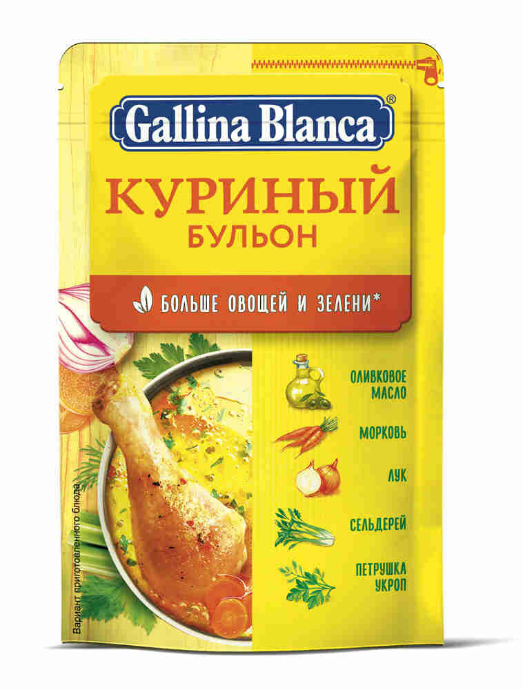 Gallina Blanca представляет новое поколение рассыпчатых бульонов с формулой, обогащенной оливковым маслом, с еще большим количеством овощей и зелени. Инновационная практичная упаковка с устойчивым дном и многоразовой застежкой делает хранение и использование продукта еще более удобным.