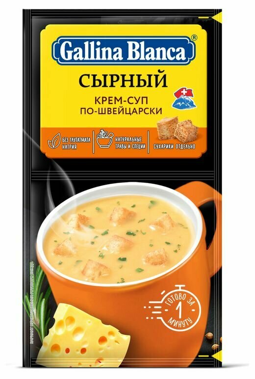 Gallina Blanca представляет новый крем-суп 2 в 1 сырный по-швейцарски с сухариками из натурального белого хлеба. Благодаря сочетанию традиционного голубого сыра с пармезаном, чеддером и романо мягкий и насыщенный вкус поразит самого привередливого гурмана. Готовится за 1 минуту.