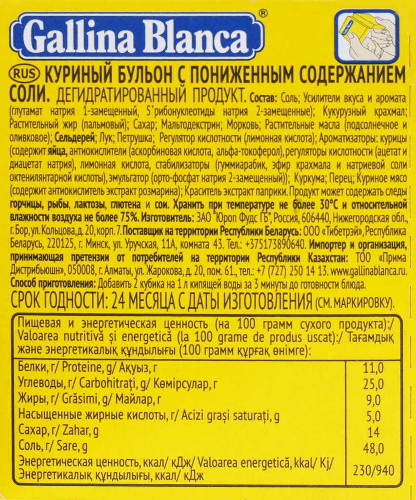 | Состав | соль йодированная, кукурузный крахмал, гидрированный растительный жир (пальмовый), мальтодекстрин, усилитель вкуса и аромата (глутамат натрия, 5-рибонуклеотиды натрия), сахар, экстракты растительных белков (содержат глютен), подсолнечное масло, ароматизаторы (содержат яйца), куркума, куриное мясо, петрушка, сельдерей, лук, морковь, перец, краситель - рибофлавин (витамин в2) |
