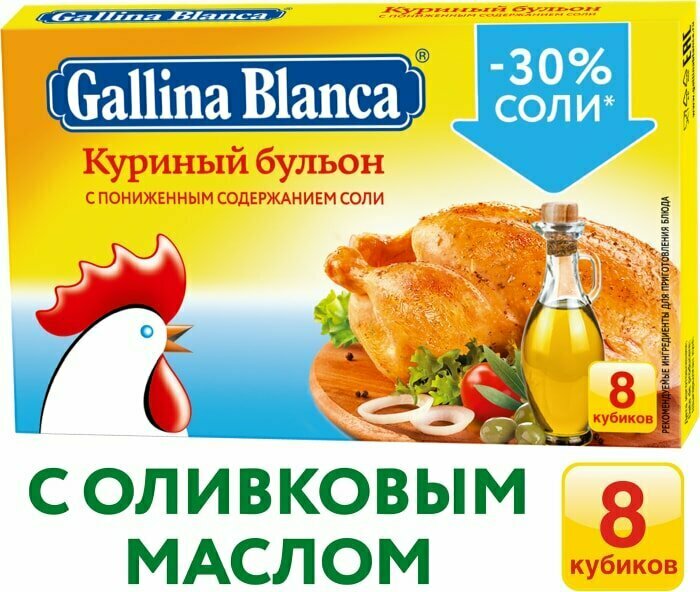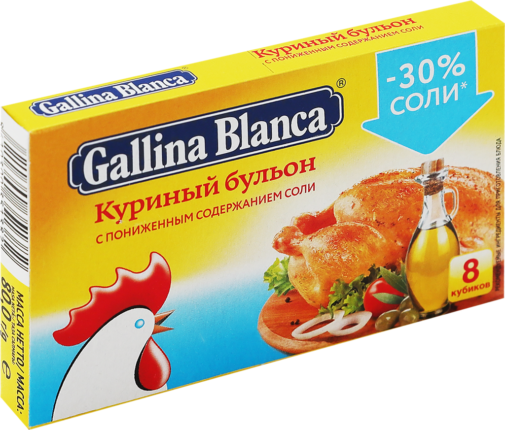 Вам не нужно отказываться от традиционного вкуса ваших супов – Gallina Blanca заботится о вашем здоровье, делая ваши блюда такими же вкусными и ароматными, как прежде, с кубиком куриного бульона. Контролировать количество потребляемой соли стало гораздо проще и приятнее с Gallina Blanca! Используйте кубик Gallina Blanca не только при приготовлении бульона, но и гарнира, чтобы сделать его привлекательным и золотистым.