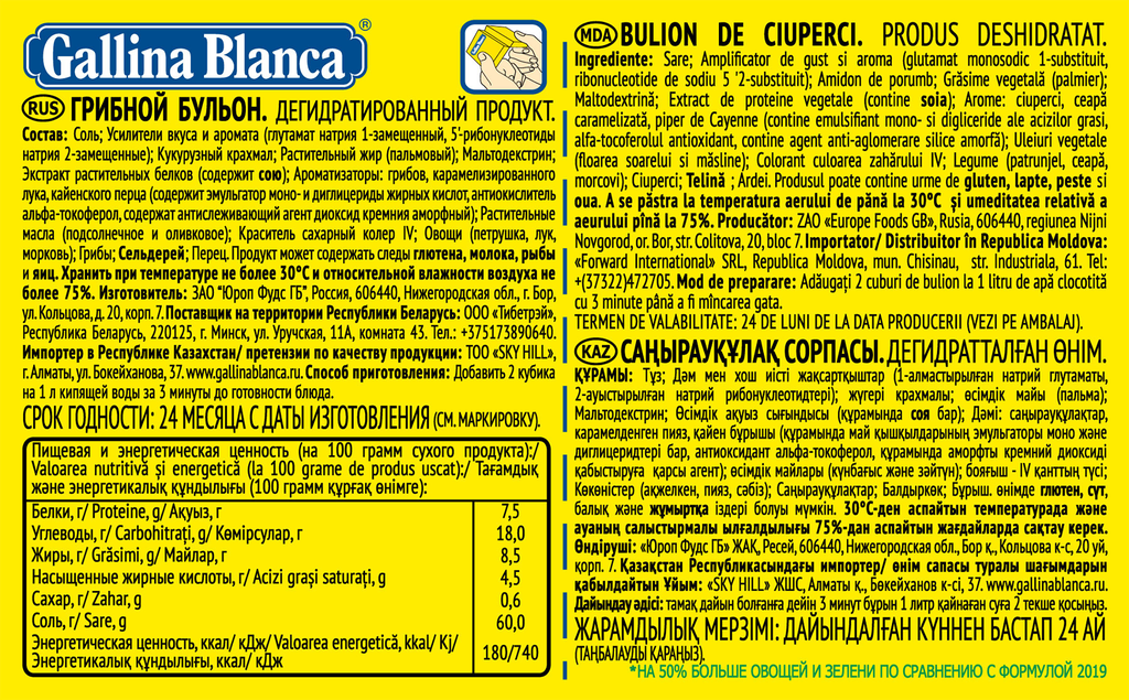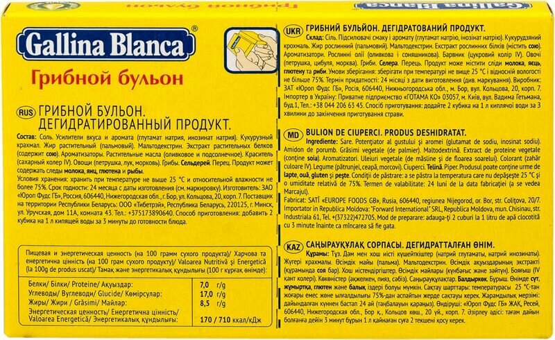 | Состав | соль, усилители вкуса и аромата (глутамат натрия, ингозинат натрия), кукурузный крахмал, гидрированный растительный жир (пальмовый), мальтодекстрин, экстракт растительных белков (содержит сою), ароматизаторы, растительные масла (оливковое и подсолнечное, краситель (сахарный колер 4), овощи (петрушка, лук, морковь), грибы, сельдерей, перец. продукт может содержать следы молока, яиц и глютена. |