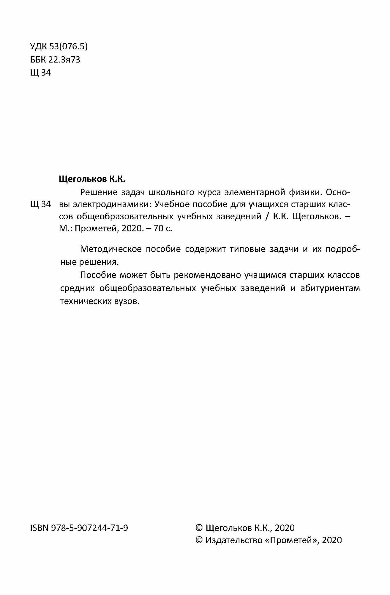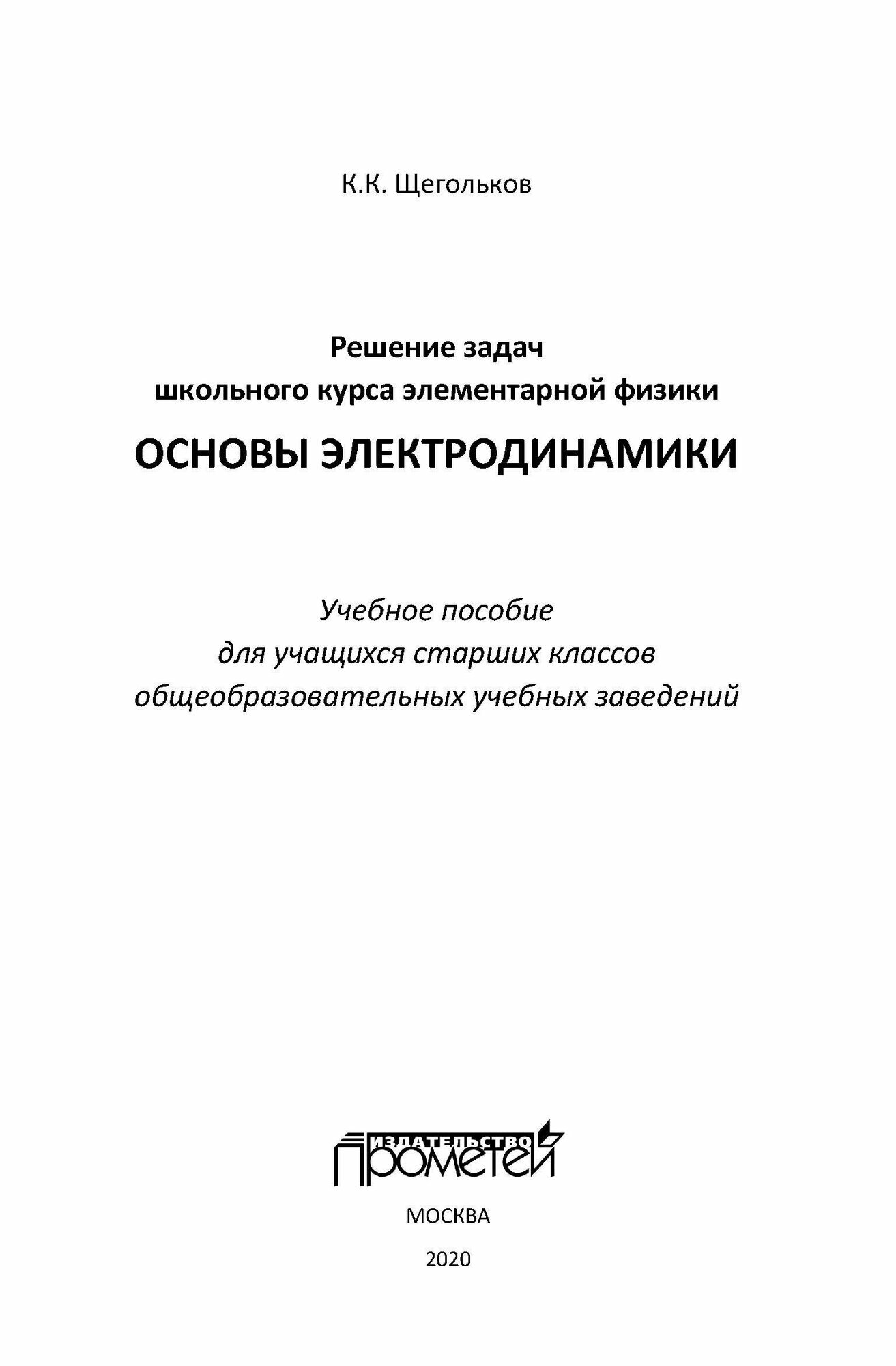 Решение задач школьного курса элементарной физики. Основы электродинамики (Константин Щегольков); Прометей, 2020