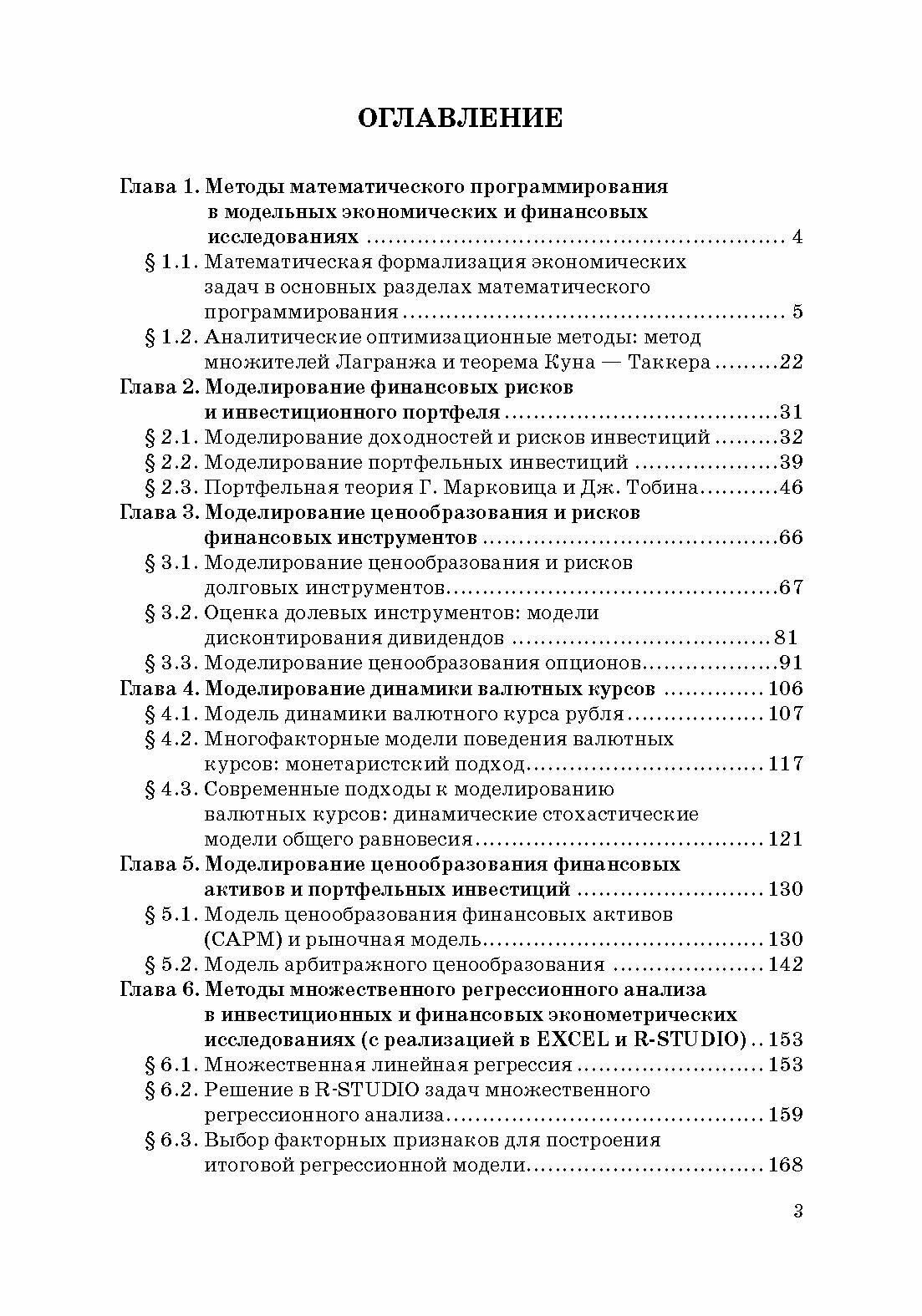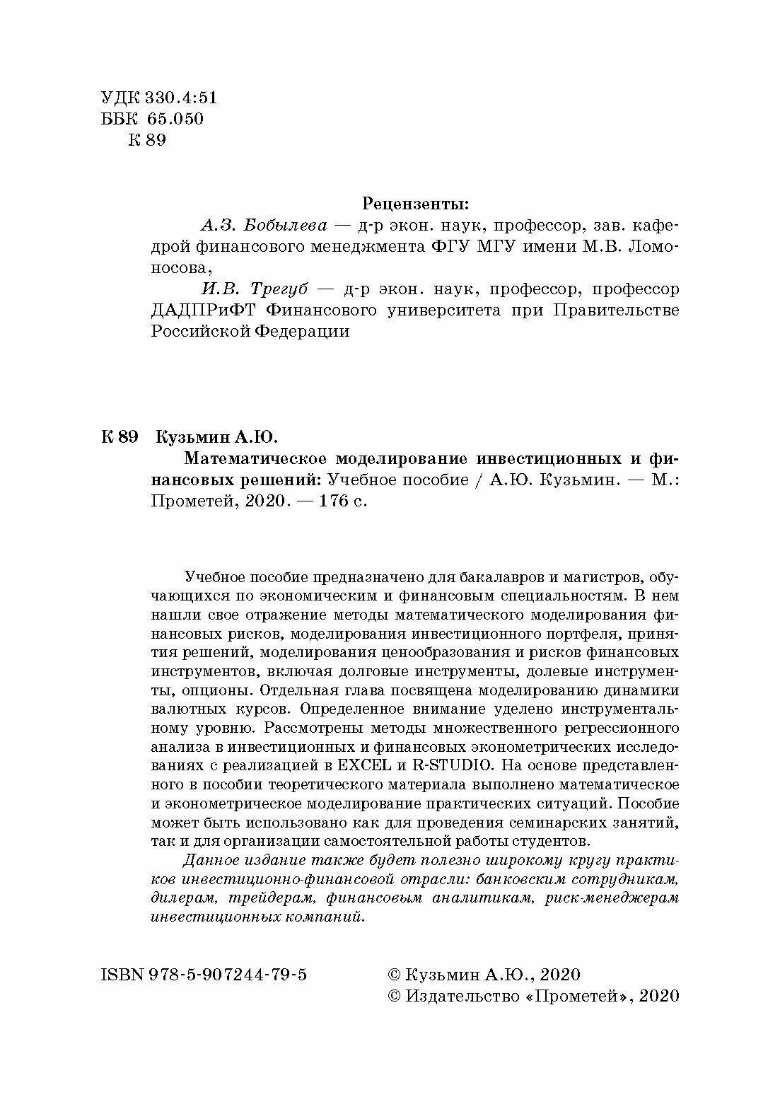 Учебное пособие предназначено для бакалавров и магистров, обучающихся по экономическим и финансовым специальностям. В нем нашли свое отражение методы математического моделирования финансовых рисков, моделирования инвестиционного портфеля, принятия решений, моделирования ценообразования и рисков финансовых инструментов, включая долговые инструменты, долевые инструменты, опционы. Отдельная глава посвящена моделированию динамики валютных курсов. Определенное внимание уделено инструментальному уровню. Рассмотрены методы множественного регрессионного анализа в инвестиционных и финансовых эконометрических исследованиях с реализацией в EXCEL и R-STUDIO. На основе представленного в пособии теоретического материала выполнено математическое и эконометрическое моделирование практических ситуаций. Пособие может быть использовано как для проведения семинарских занятий, так и для организации самостоятельной работы студентов. Данное издание также будет полезно широкому кругу практиков инвестиционно-финансовой отрасли: банковским сотрудникам, дилерам, трейдерам, финансовым аналитикам, риск-менеджерам инвестиционных компаний.