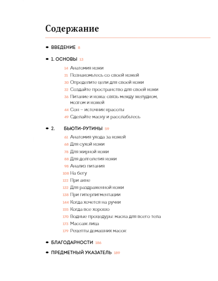 В книге несколько разделов, изучив которые, вы поймёте каким типом кожи обладаете, какие нутриенты полезны для вашей кожи и где содержатся, как и какие маски для лица делать, как правильно очищать кожу и великое множество советов для различных жизненных ситуаций (перелеты, тренировки и др.).