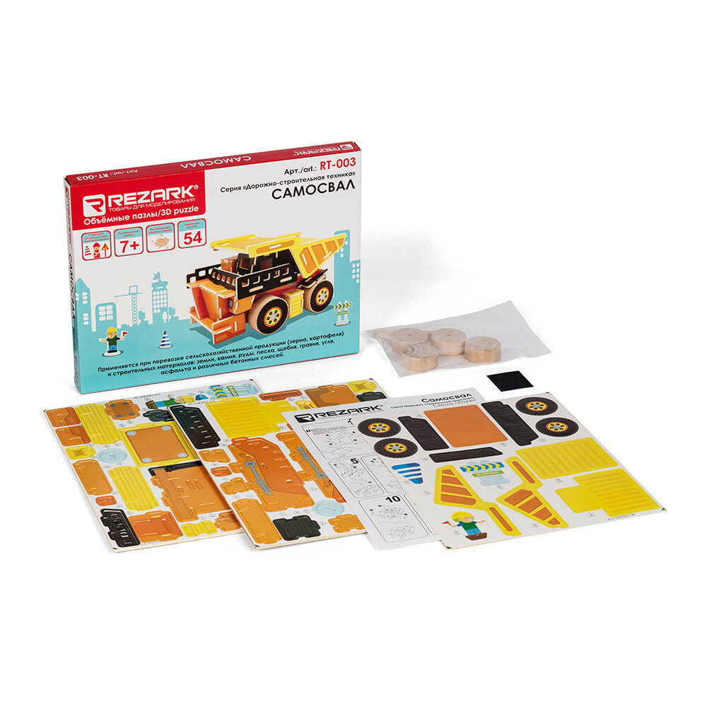 Rezark представляет детские, развивающие 3D-наборы для сборки, изготовленные из качественной фанеры. Данная серия посвящена дорожно-строительной технике. В состав набора входят детали пазла и иллюстрирующие их самоклеящиеся наклейки.Это и игрушка, и конструктор "два в одном". Сборка из 3D-пазлов развивает моторику рук, объёмное мышление и внимание. А подвижные элементы модели позволяют использовать её как полноценную игрушку, с которой можно играть, строить, перевозить и т.д.