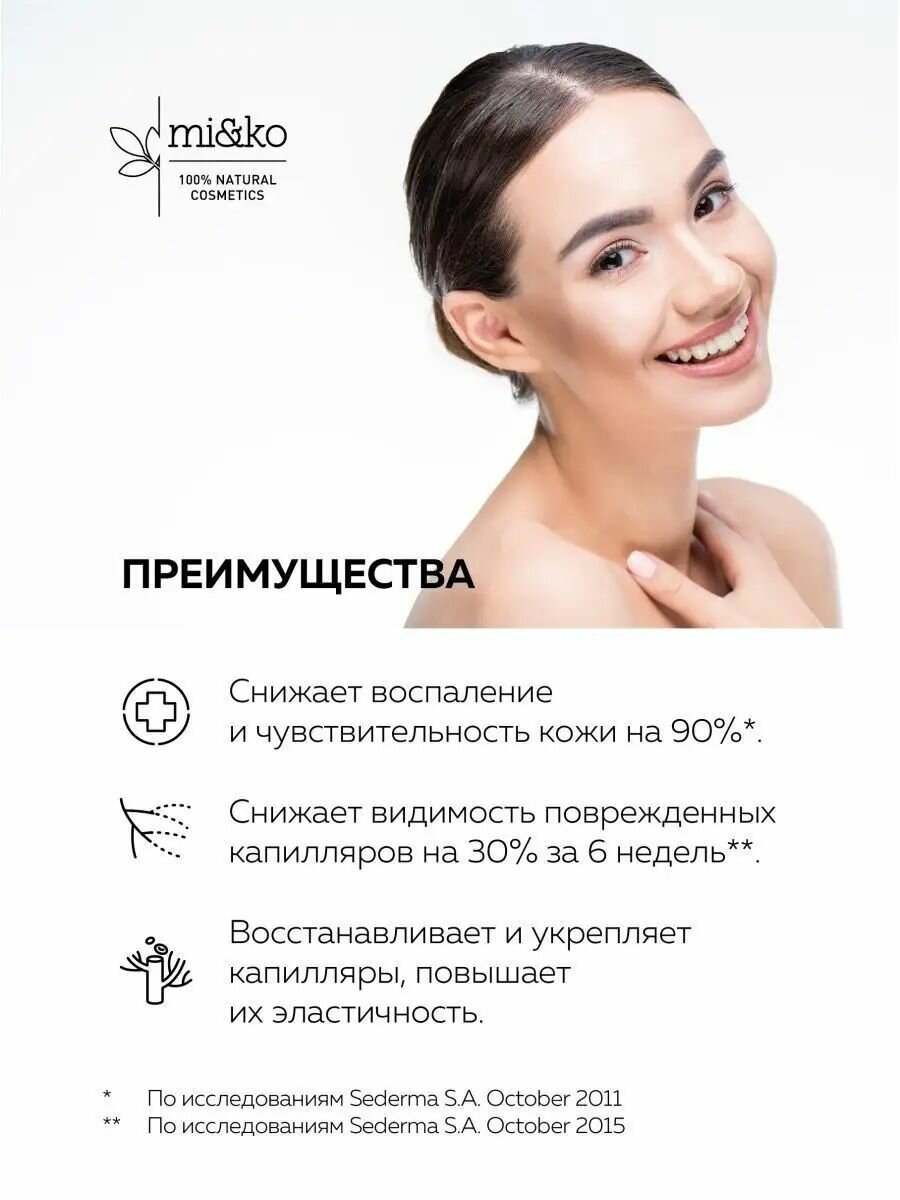 Крем – это спасительный вариант ухода за кожей лица, для которой характерны сосудистые звёздочки и покраснения. Формула крема позволяет обеспечить полный контроль над признаками розацеи и купероза. Благодаря сочетанию масел и экстрактов, крем: Снижает покраснение лица и уменьшает видимость поврежденных капилляров на 30% уже за 6 недель. Предотвращает и регулирует процесс расширения кровеносных сосудов. Увеличивает синтез коллагена, восстанавливает и стабилизирует капилляры. Снимает воспаление и чувствительность на 90%. Результативность крема обеспечивается благодаря гликозиду розмариновой кислоты, который усиливает кровоток и увеличивает эластичность капилляров, гидролату гамамелиса, который укрепляет стенки сосудов и маслу макадамии, обладающему высокими смягчающими и антиоксидантными свойствами