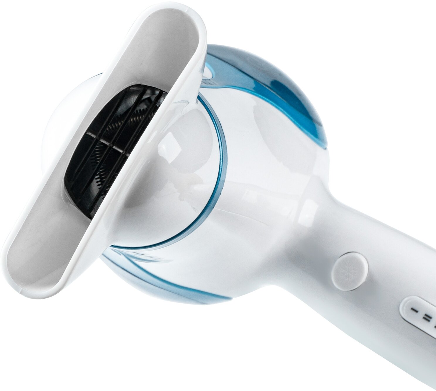 Фен Galaxy GL-4327 отличается легкостью и весит всего 570 г. Модель в белоснежном корпусе украшена голубыми декоративными элементами. Высокая мощность, равная 2200 Вт, обеспечивает быструю сушку волос. Фен имеет несколько режимов нагрева и может выдавать воздух с разной скоростью, что открывает множество возможностей для создания различных укладок. Также предусмотрена функция подачи холодного воздуха, которая позволяет надежно зафиксировать готовую укладку. Galaxy GL-4327 укомплектован насадкой-концентратором для направленной подачи воздушного потока. Фен подключается к сети с помощью 1.8-метрового шнура. Модель оснащена удобной петелькой, которая дает возможность подвесить фен рядом с местом использования.