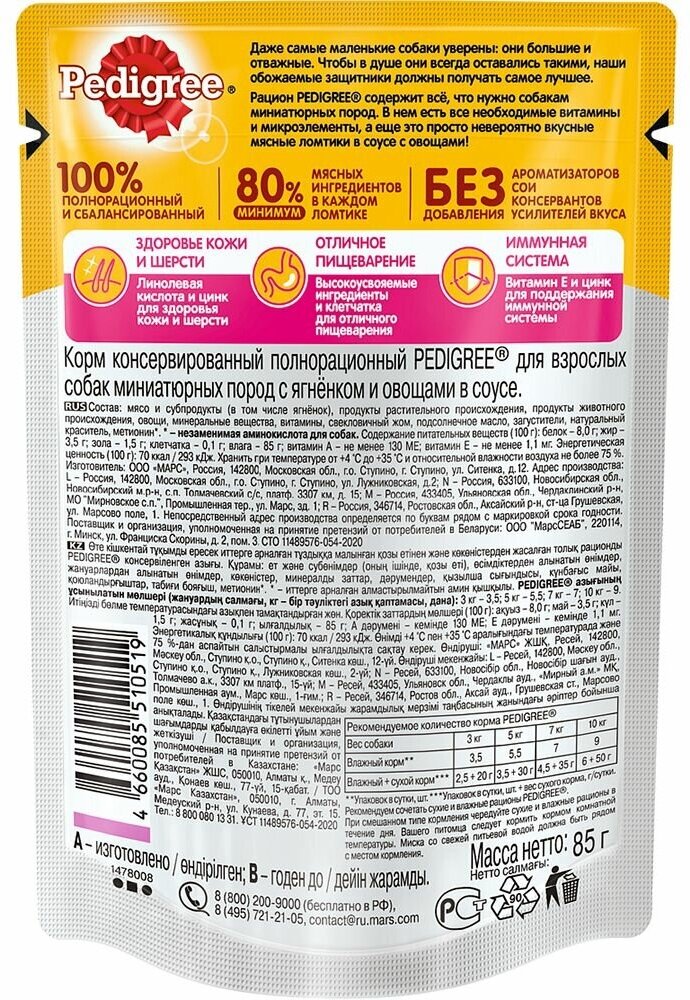 Рекомендации по кормлению: Бренд PEDIGREE рекомендует сочетать разные форматы корма в рационе Вашей собаки. Утром и вечером Вашему питомцу нужно давать влажный рацион, а в течение дня - сухой. Это позволит объединить преимущества каждого из форматов, ведь ее рацион должен быть не только вкусным, но и тщательно сбалансированным. Нужно помнить, что смешивать в одной миске сухой и влажный рационы не рекомендуется. Кроме того, у вашей собаки всегда должен быть доступ к чистой питьевой воде. Рационы PEDIGREE содержат все необходимые витамины и минералы, белки, жиры и углеводы, чтобы поддержать здоровье Вашей собаки.
