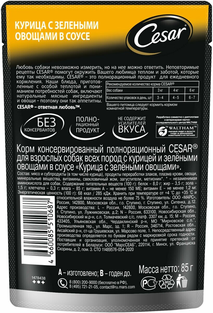 | Рекомендации | Рекомендуемое количество корма CESAR® (вес животного, кг – упаковок корма в сутки, шт): 3 кг – 3-4; 4 кг – 4-5; 6 кг – 6-7. Вашего питомца следует кормить кормом комнатной температуры. |