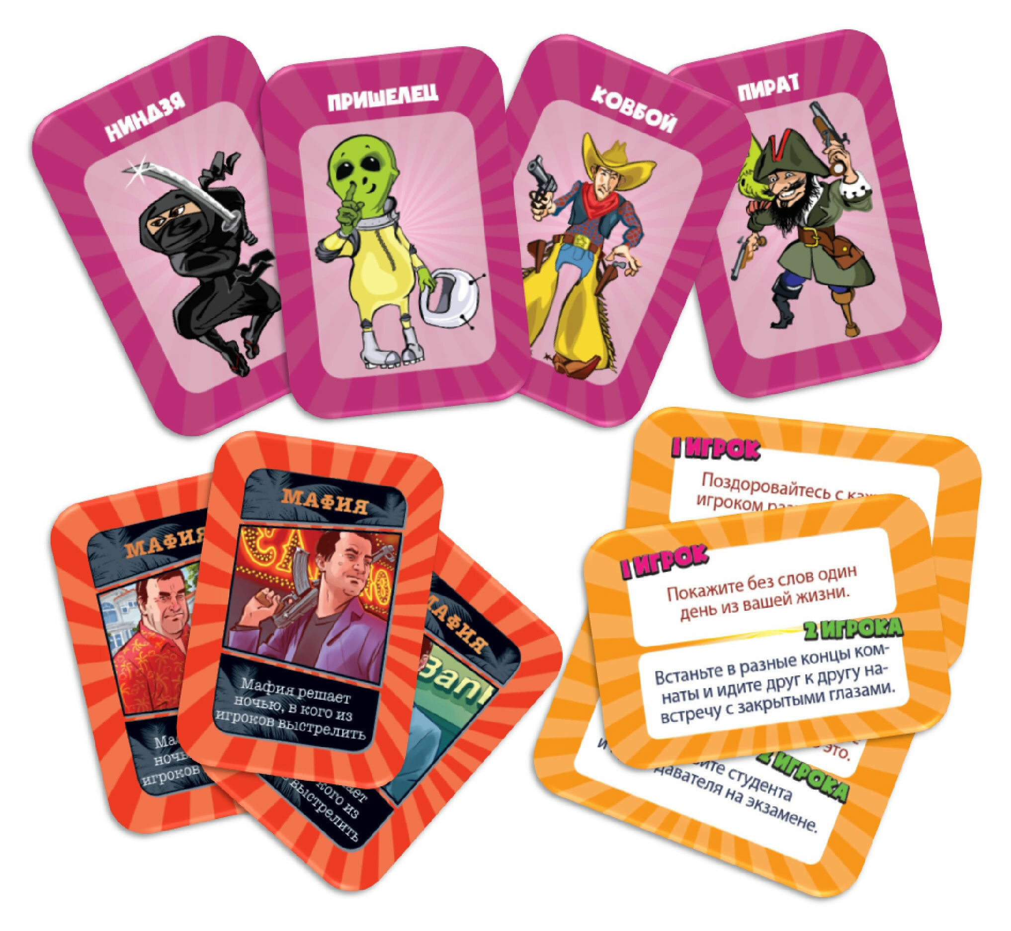 | Комплектация | игровые карточки "Мафия" - 30 шт; игровые карточки "Фанты" - 24 шт; игровые карточки "Кто это?" - 24 шт; правила игры - 3 шт |