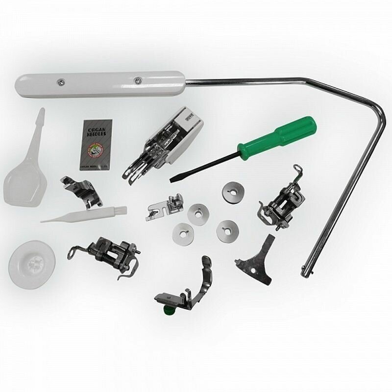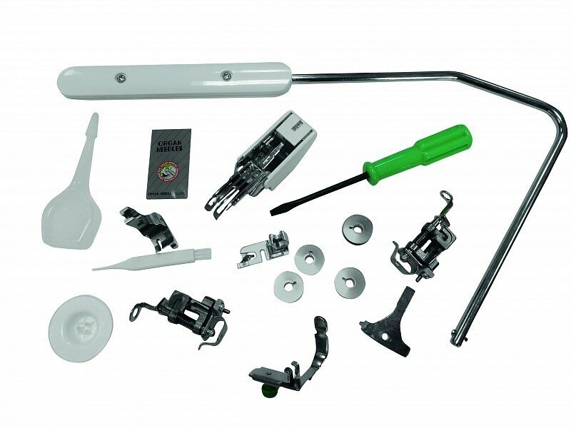| Комплект поставки | Лапка для квилтинга; Лапка для стёжки; Лапка универсальная; Лапка для вшивания молний; Лапка для подрубки; Лапка прямострочная; Коленоподьемник; Приставной столик; Шпульки; Комплект игл; Вспарыватель; Педаль; Мягкий чехол; Масленка; Отвертка; Верхние держатели для катушек; Щетка-кисточка; Инструкция |
