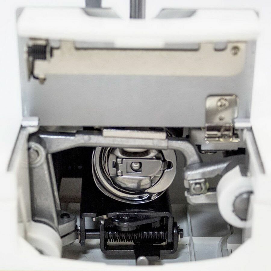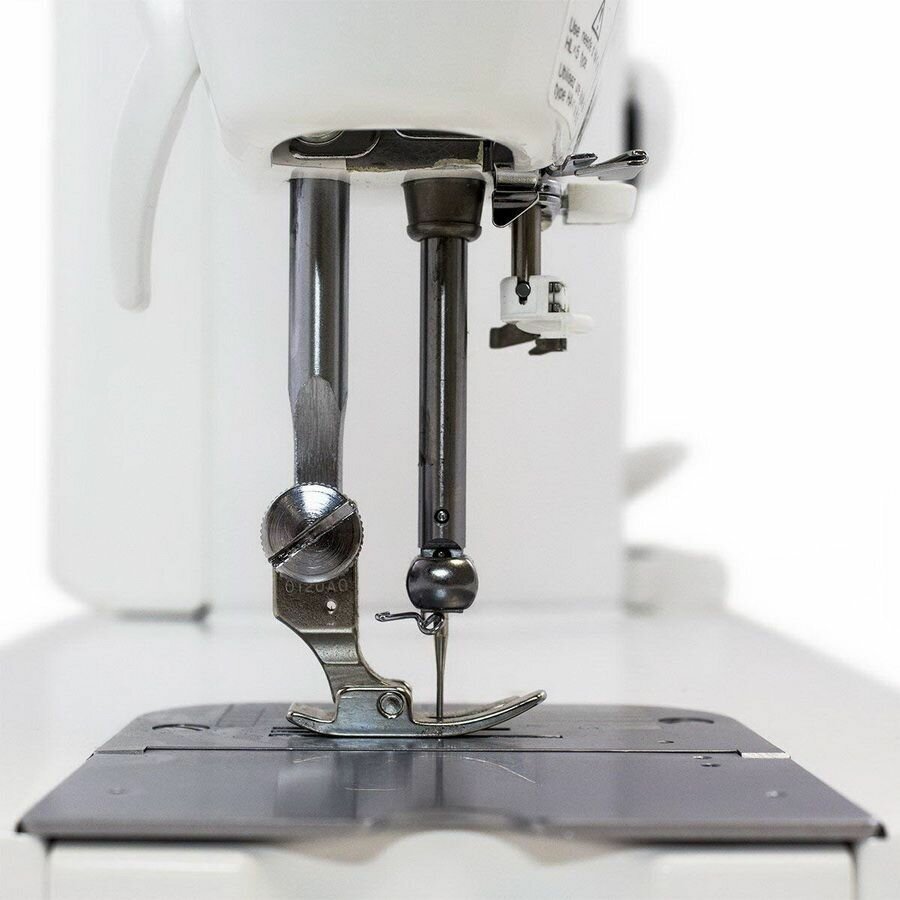 Рамная конструкция машинки значительно снижает уровень вибрации во время работы, а рукавная платформа позволяет снять часть рабочего столика, чтобы легко шить узкие элементы.
