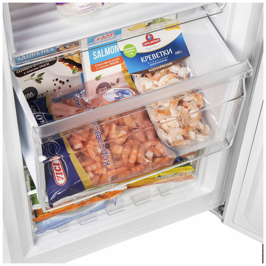Морозильник понравился, пользуемся 2 месяца. В морозильнике 4 ящика и 2 полки, под каждым ящиком есть стеклянная полка, в дверце 2 узких контейнера-полки. В целом не шумный, гудит только в режиме "суперзаморозки", но морозит хорошо. Вместительный. Покупкой довольны.