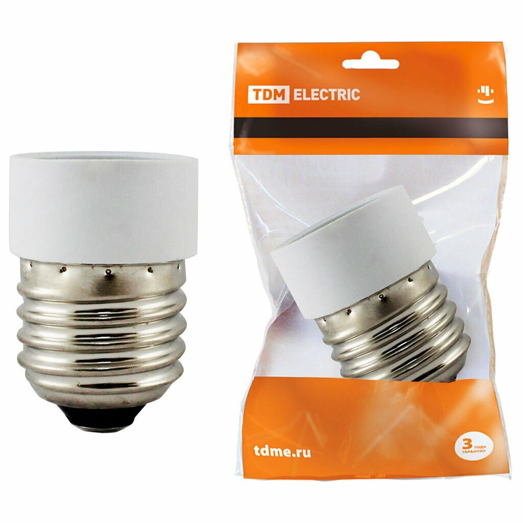Переходник TDM E27-E14 белый (аналог SBE-A-E27-14) используется для подключения лампы с цоколем, отличным от типа патрона конкретного светильника. Контактная группа изготовлена из латуни, корпус - из полибутилентерефталата (ПБТ, PBT) - материала, обладающего высокой химической устойчивостью, теплостойкостью и механической прочностью. Также материал является отличным диэлектриком. Такие качества обеспечивает повышенный срок эксплуатации переходника.