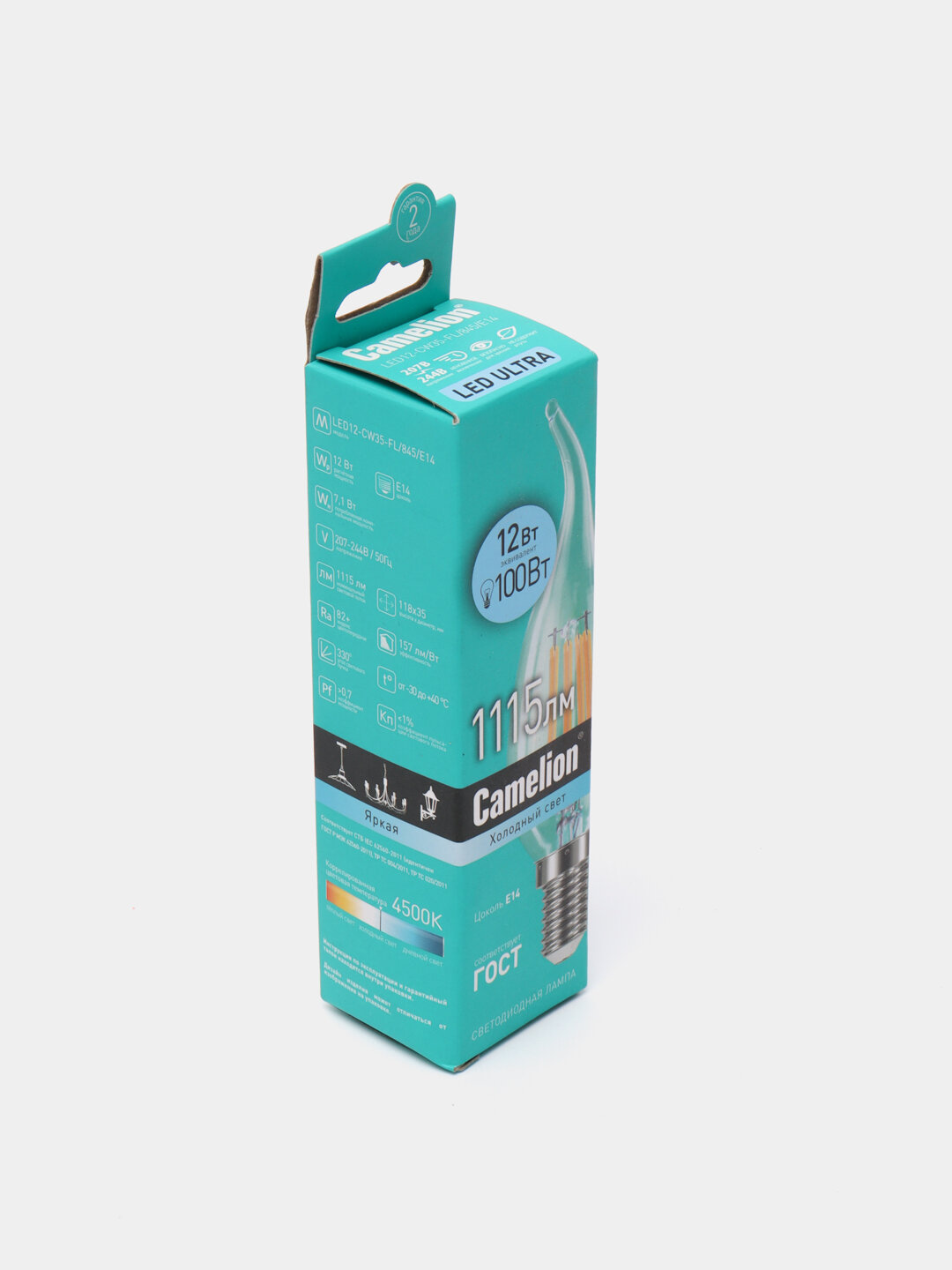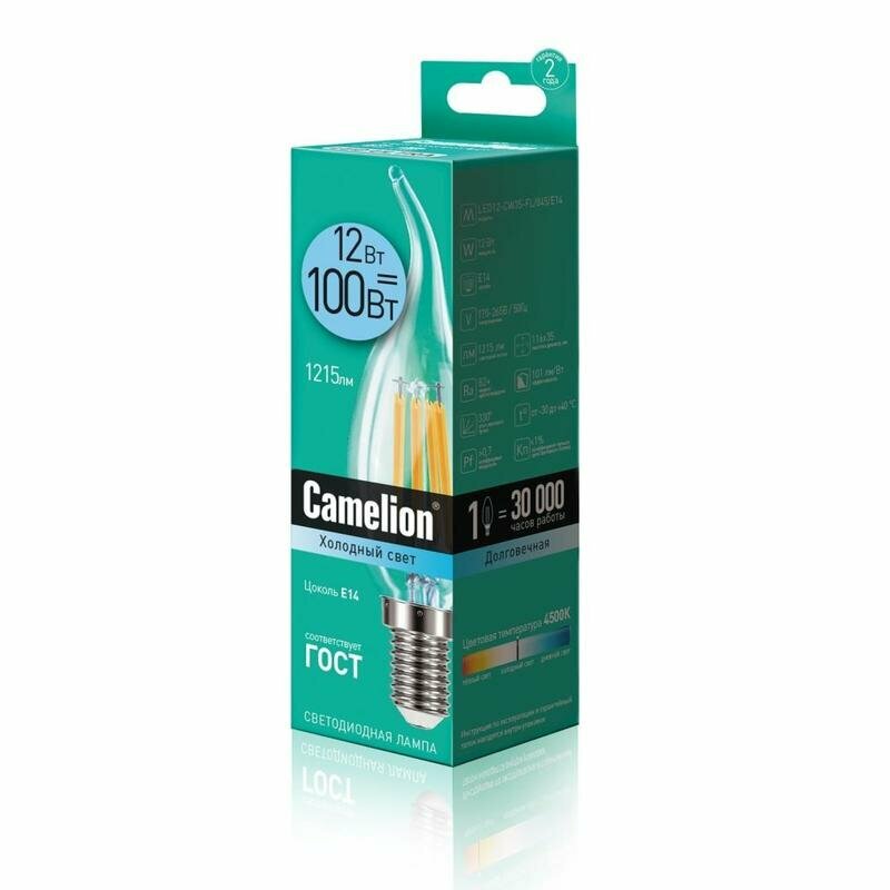 Светодиодная лампа Camelion LED7-CW35-FL/845/E14 13455 предназначена для общего освещения и оснащена цоколем типа E14. Она имеет мощность 7 Вт и обеспечивает световой поток 850 лм, что соответствует эквиваленту лампы накаливания мощностью 80 Вт. Цветовая температура составляет 4000 К, что соответствует естественному белому свету в диапазоне 3300-5000 К. Лампа обладает хорошей цветопередачей с индексом Ra 82 и световой отдачей 109 лм/Вт. Срок службы лампы составляет 30 000 часов, что делает её долговечным источником света. Габаритные размеры лампы: длина — 118 мм, диаметр — 35 мм, форма — свеча на ветру, угол рассеивания — 330°. Лампа не имеет встроенного аккумулятора, датчиков движения или освещенности, а также не поддерживает регулировку яркости светового потока. Она подходит для использования с выключателями с подсветкой. Рабочий диапазон температур составляет от -30 до +40 °С, а напряжение — 220-240 В. Лампа имеет класс энергоэффективности A+ и коэффициент пульсации менее 1%. В упаковке находится одна лампа, вес с упаковкой составляет 0.03 кг, а длина упаковки — 35 мм.