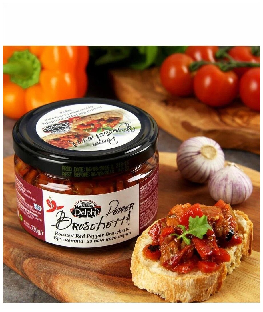 Брускетта из печеного перца, зеленых оливок, чеснока и зелени буквально создана для хрустящего и поджаренного багета. Закуска делается элементарно и очень быстро. Результат получается достойным романтического ужина и праздничного застолья. Также продукт бренда Delphi подходит для завтрака. Брускетту можно добавлять в яичницу или омлет.Сделано в Греции.