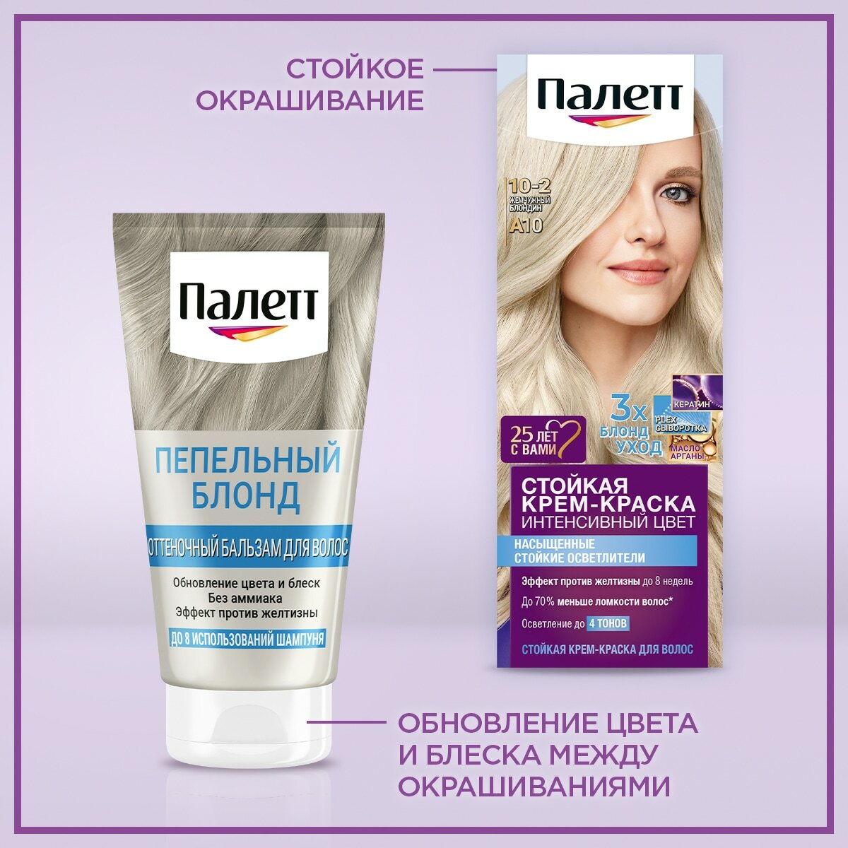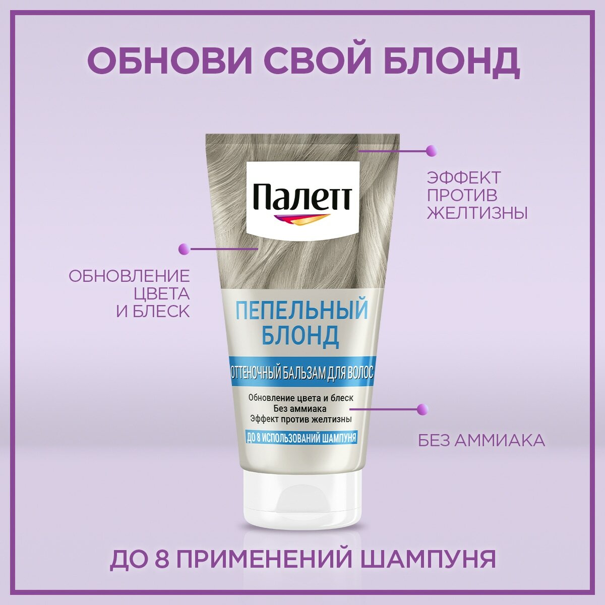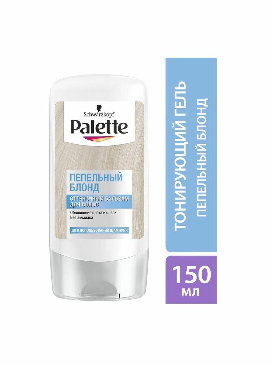 Оттеночный бальзам Palette пепельный блонд придает пепельный оттенок светлым волосам. Благодаря обновлению цвета и уходу в перерывах между осветлением волосы выглядят здоровыми и ухоженными.