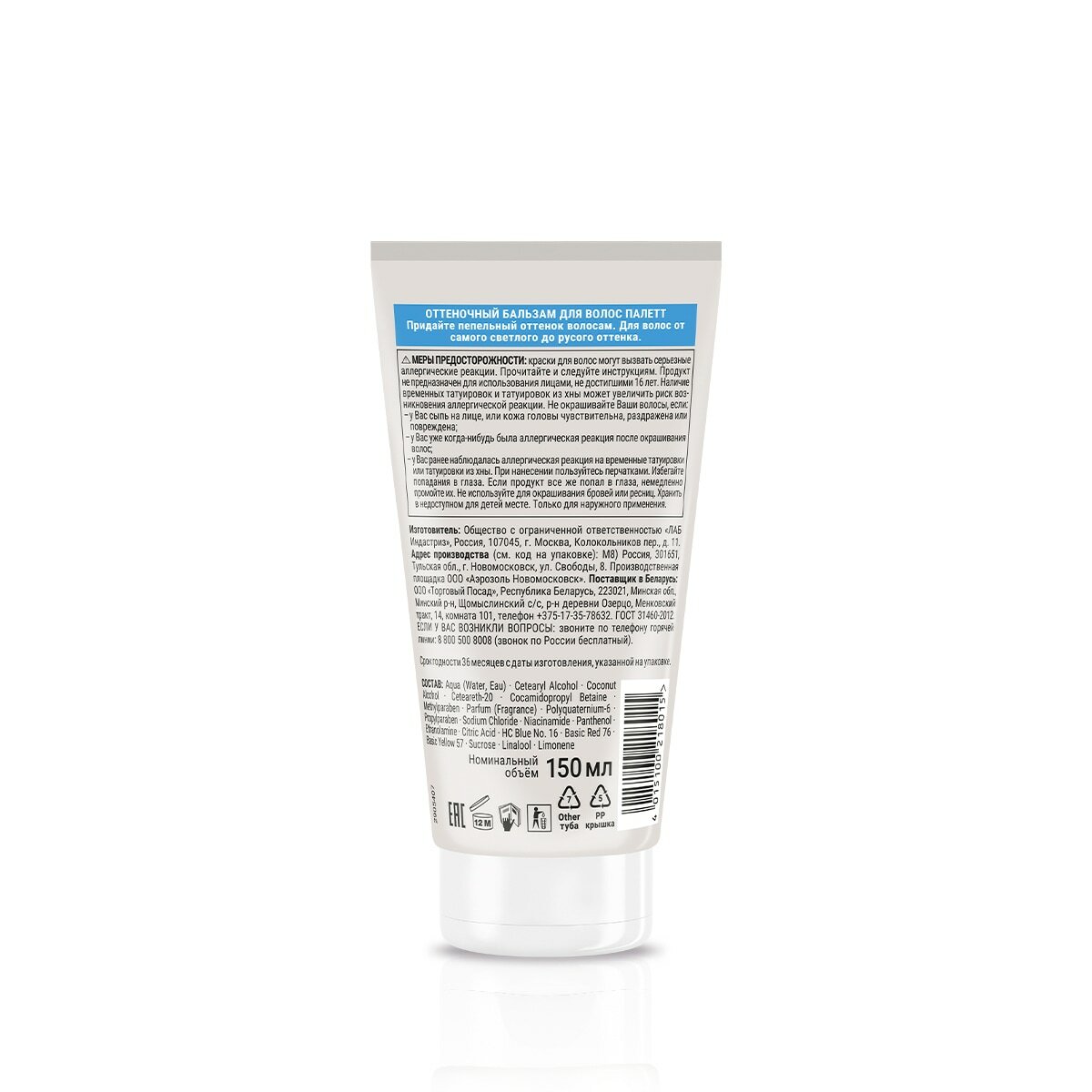 | Химический состав | Aqua (Water, Eau), Cetearyl Alcohol, Coconut Alcohol, PEG-8, Ceteareth-20, Disodium Cocoamphodipropionate, HC Blue No. 12, Methylparaben, Parfum (Fragrance), Polyquaternium-6, Propylparaben, Niacinamide, Panthenol, Ethanolamine, Basic Brown 17, 2-Amino-6- Chloro-4-Nitrophenol, Limonene, Linalool. |