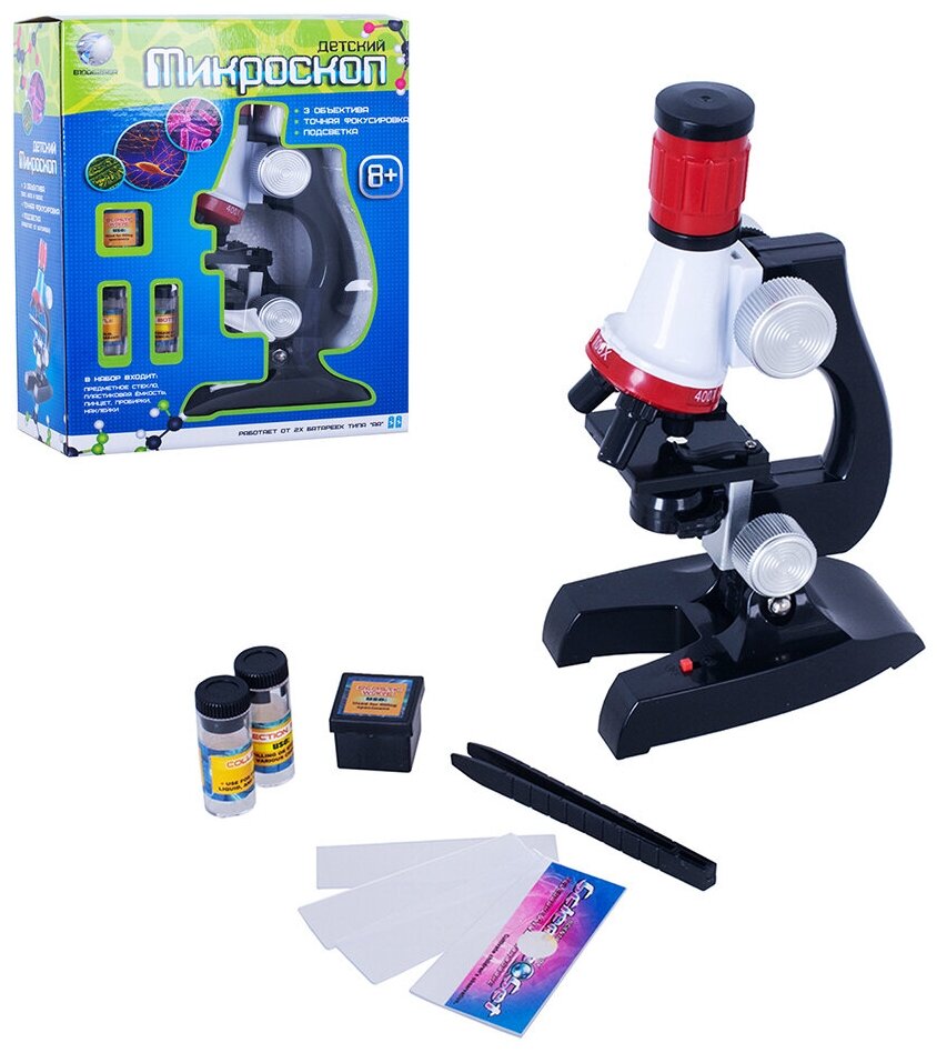 | Комплектация | микроскоп с линзами; слайды; пинцет; пробирки; лента-самоклейка; контейнер пластиковый |