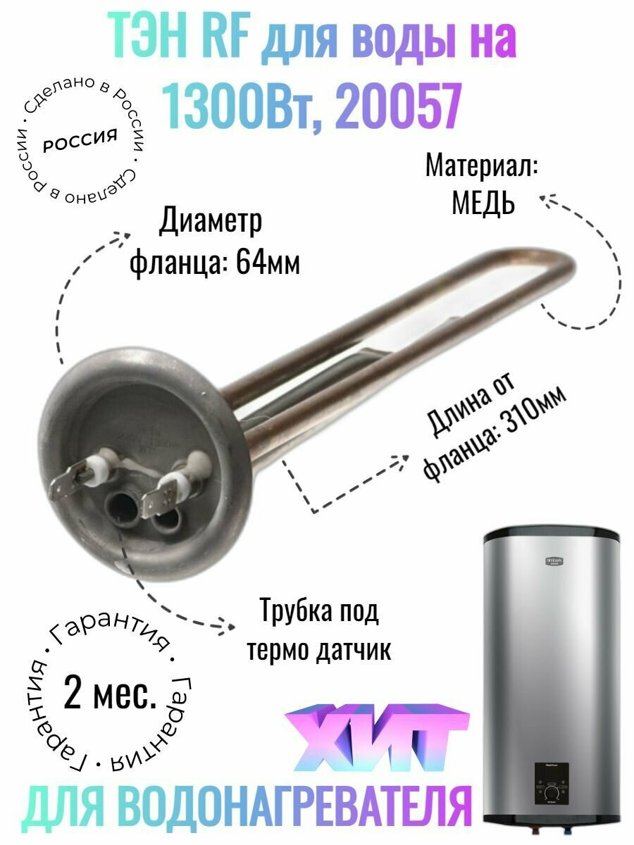 Надежный и универсальный ТЭН мощностью 1,3 кВт (1300 Ватт) предназначен для использования в водонагревателях моделей Thermex, Garanterm RZB, IF, ID. Он подходит для подключения к моделям, имеющим вертикальную плоскую конструкцию с баком из нержавеющей стали. ТЭН имеет резьбу М4 под магниевый анод и длину 250мм, что обеспечивает простую установку в подходящие модели. В комплекте поставляются 2 трубки для термостата и термозащиты, обеспечивая надежную работу системы. Диаметр фланца ТЭНа составляет 64 мм, что гарантирует его совместимость с широким спектром водонагревателей. Рабочее напряжение 220 В обеспечивает стабильность работы и эффективный нагрев воды. ТЭН изготовлен из меди, что является надежным и прочным материалом, обеспечивающим долгую и безопасную эксплуатацию. Он прост в уходе и не подвержен коррозии. Этот ТЭН совместим с такими моделями водонагревателей, как Thermex ID Touch Diamond, Flat Plus, Garanterm Image GTI и другими моделями от этих и других производителей. Он идеально подходит к моделям Thermex IF 30 V, IF 50 V, IF 80 V, IF 100 V, ID 30 V, ID 50 V, ID 80 V, ID 100 V, RZB 30 FV, RZB 50 FV, RZB 80 FV, RZB 100 FV, RZB 30 L, RZB 50 L, RZB 80 L, RZB 100 L, RZB 30 F, RZB 50 F, RZB 80 F, RZB 100 F и моделям Garanterm серии Image GTI 30V-100V, серии GTN. Если вам требуется надежный и эффективный ТЭН для вашего водонагревателя, то этот модель подходит именно вам. Закажите его прямо сейчас и убедитесь в его высоком качестве и надежности. Пожалуйста, перед заказом убедитесь, что данный ТЭН совместим с вашим водонагревателем. Размеры, мощность и другие характеристики приведены в описании товара.