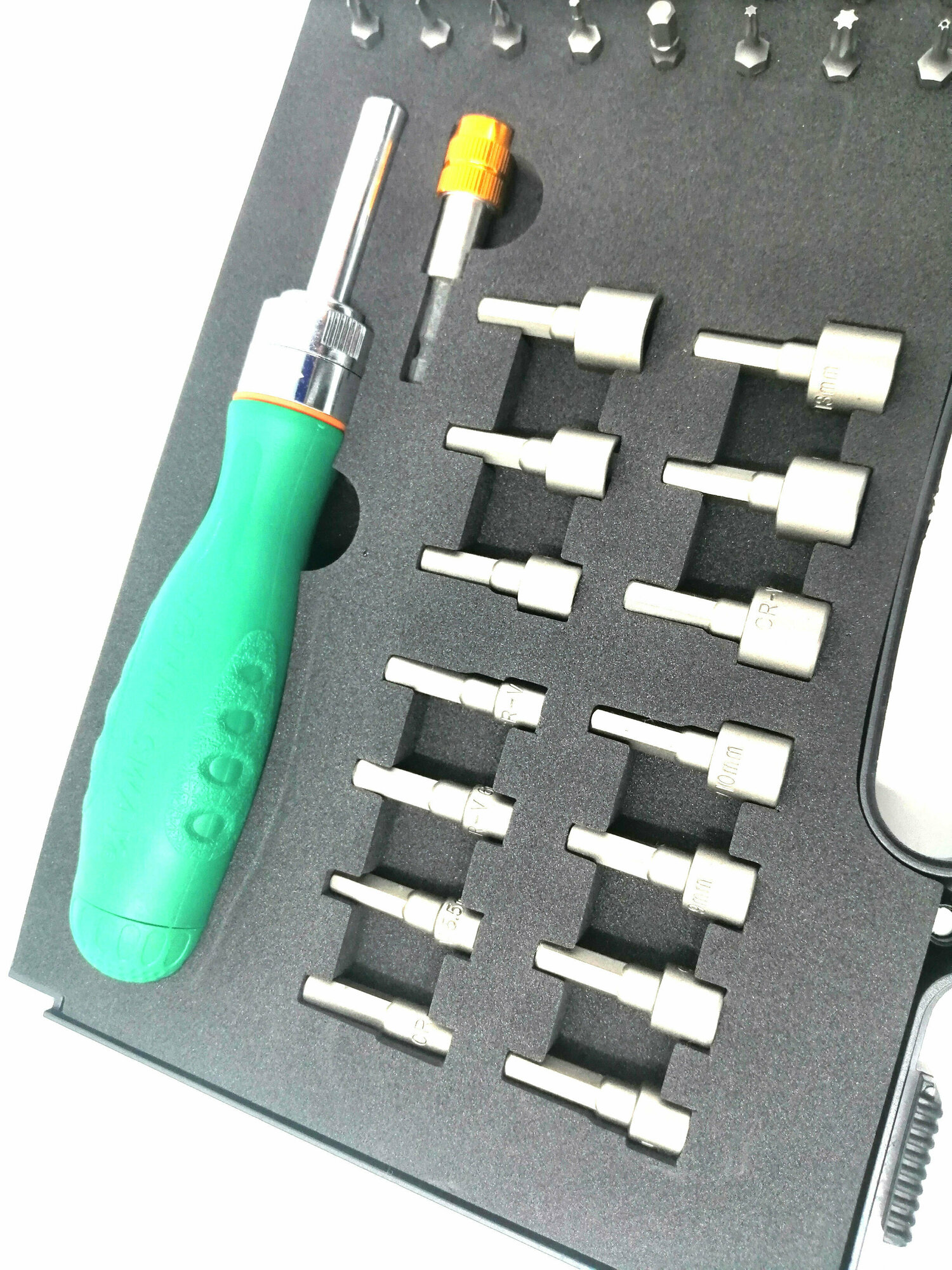 Набор инструментов Jonnesway включает в себя 52 необходимых каждому мастеру инструментов, а именно трещоточную рукоятку с набором бит и насадок. Следует отметить, что каждый элемент изготовлен из качественных прочных материалов, которые, как следствие, обеспечивают небывалую износостойкость набора в целом. Инструменты просты в использовании и обладают высокими эксплуатационными показателями. Все инструменты находятся в пластиковом кейсе с ручкой, за счет этого их удобно хранить и транспортировать.