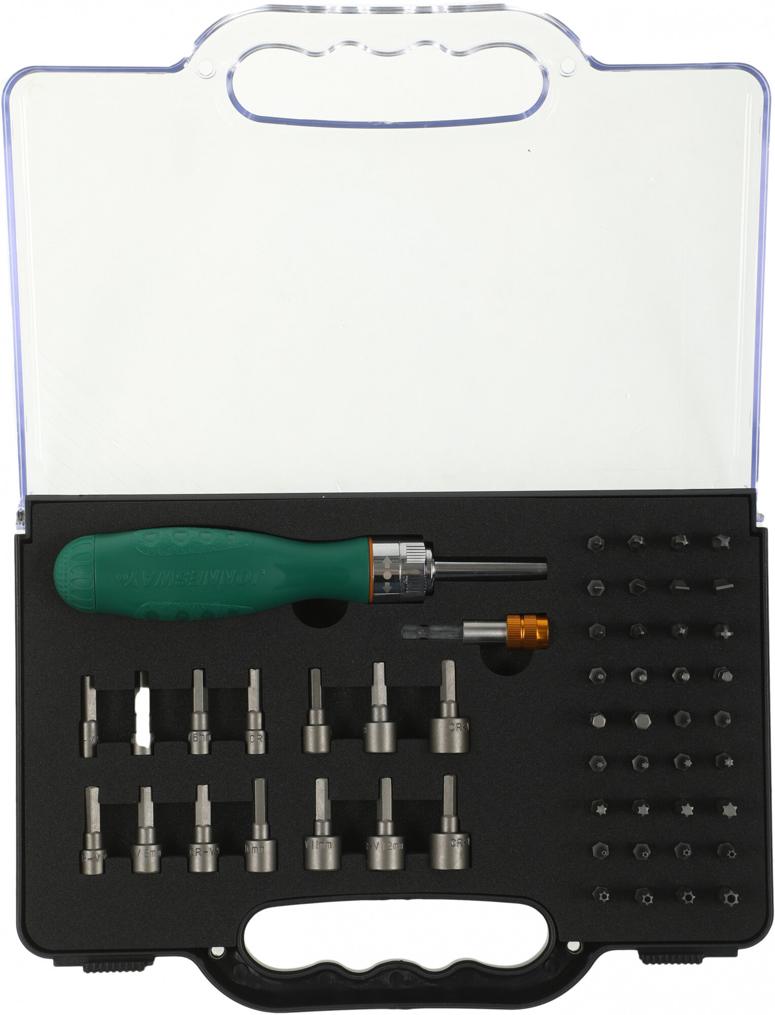 Отвертка с трещоточным механизмом и набором вставок и насадок, 52 предмета, , Jonnesway, Набор инструментов - отверточная рукоятка с храповым механизмом, набор бит и торцевые головки, 52 предмета. Биты - 37 шт, торцевые головки - 13 шт. Набор предназначен для работы с резьбовыми соединениями.
