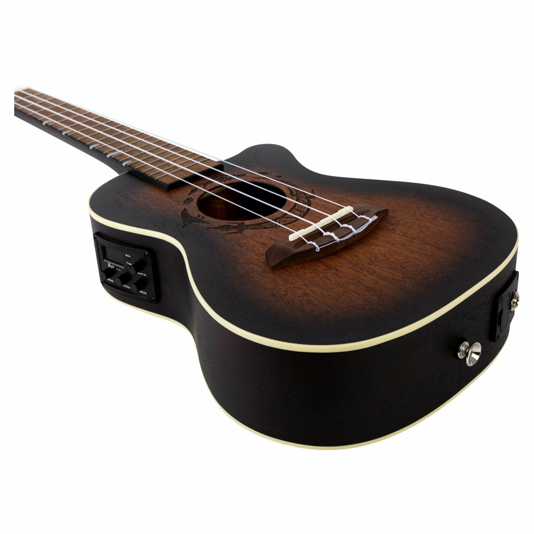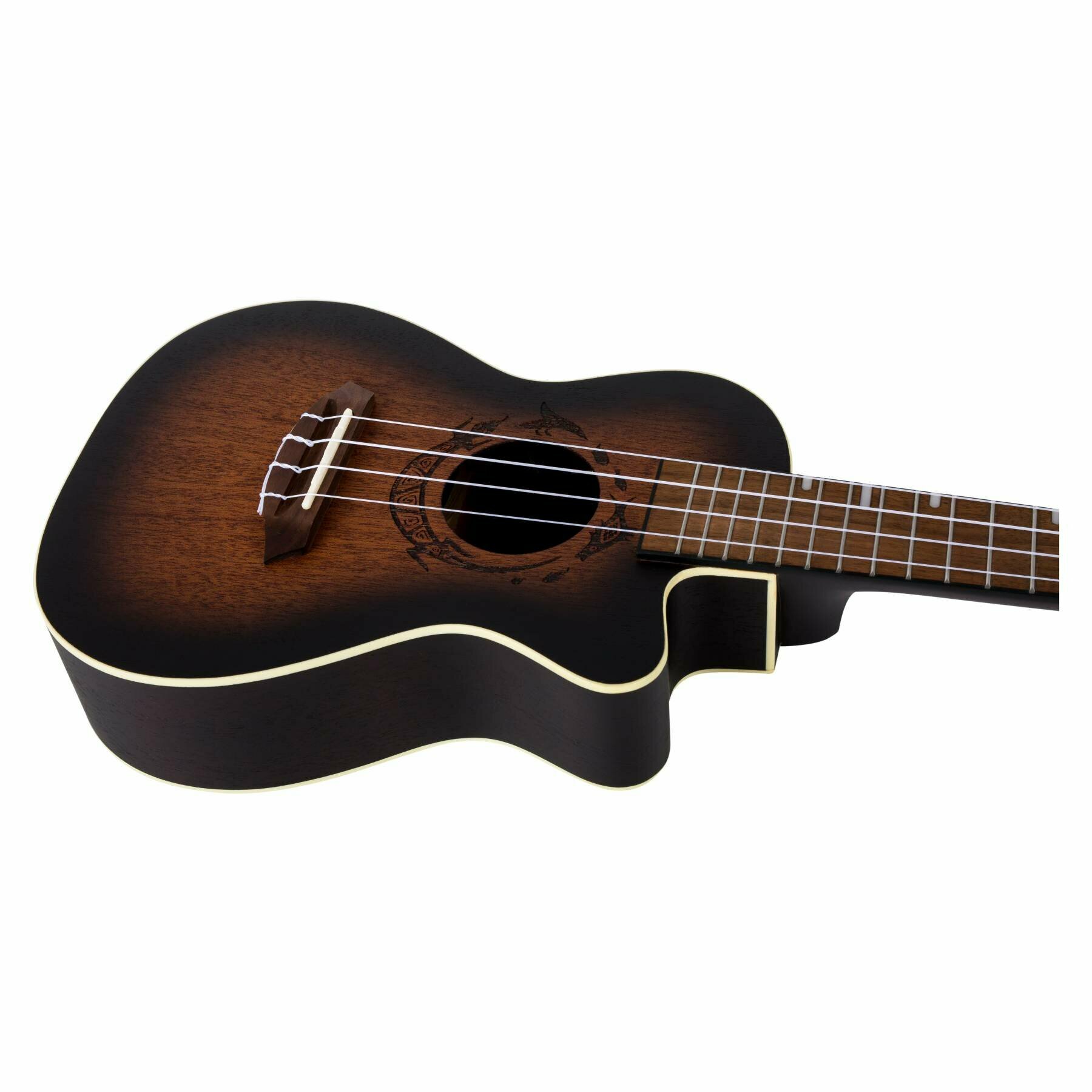 Укулеле концерт DUC380 CEQ AMBER красивого янтарно-коричневого цвета. Крутой этнический рисунок, обрамляющий розетку, сделан лазерной гравировкой.Маркировка на ладах из перламутра расположена не привычно по центру, а с левого края, что придает внешнему облику инструмента особый шарм. Вырез (cutaway) позволяет удобно дотянуться до самых нижних ладов.