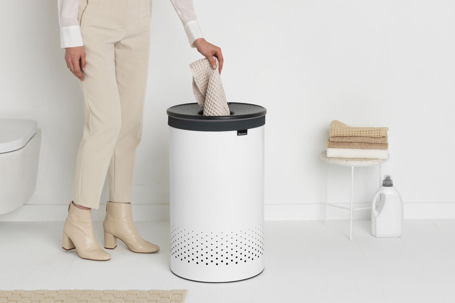 Стильный дизайн и аккуратное хранение – через крышку не видно содержимое. Удобно закладывать и доставать белье – крышка крепится на верхний обод бака. Небольшие вещи можно закладывать, не открывая крышку – загрузочное отверстие "Quick-Drop". Удобная переноска белья – съемный легко стираемый хлопковый мешок для белья. Мешок для белья удобно крепится на липучке, вкладывается и достается из бака. Вентиляционные отверстия позволяют белью «дышать». Нижний пластиковый защитный обод предохраняет пол от повреждений. Бак изготовлен из коррозионностойких материалов и идеально подходит для использования в ванной комнате.