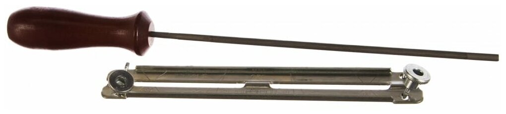 Удобная рукоятка обеспечивает быструю и правильную заточку без лишних усилий.Комплект очень удобен, занимает мало места, позволяет держать все необходимое для качественной работы пилы всегда под рукой.Комплектация:- Рукоятка - 1 шт;- Круглый напильник - 1 шт;- Обойма - 1 шт.