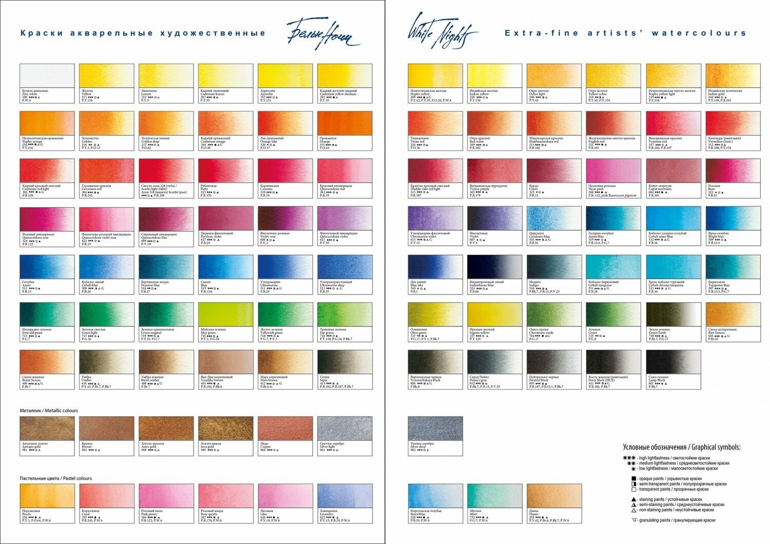 Профессиональные художественные акварельные краски «Белые ночи» представляют собой тонкодисперсные суспензии пигментов и наполнителей в связующем, в состав которого входит водный раствор растительного клея – гуммиарабика.