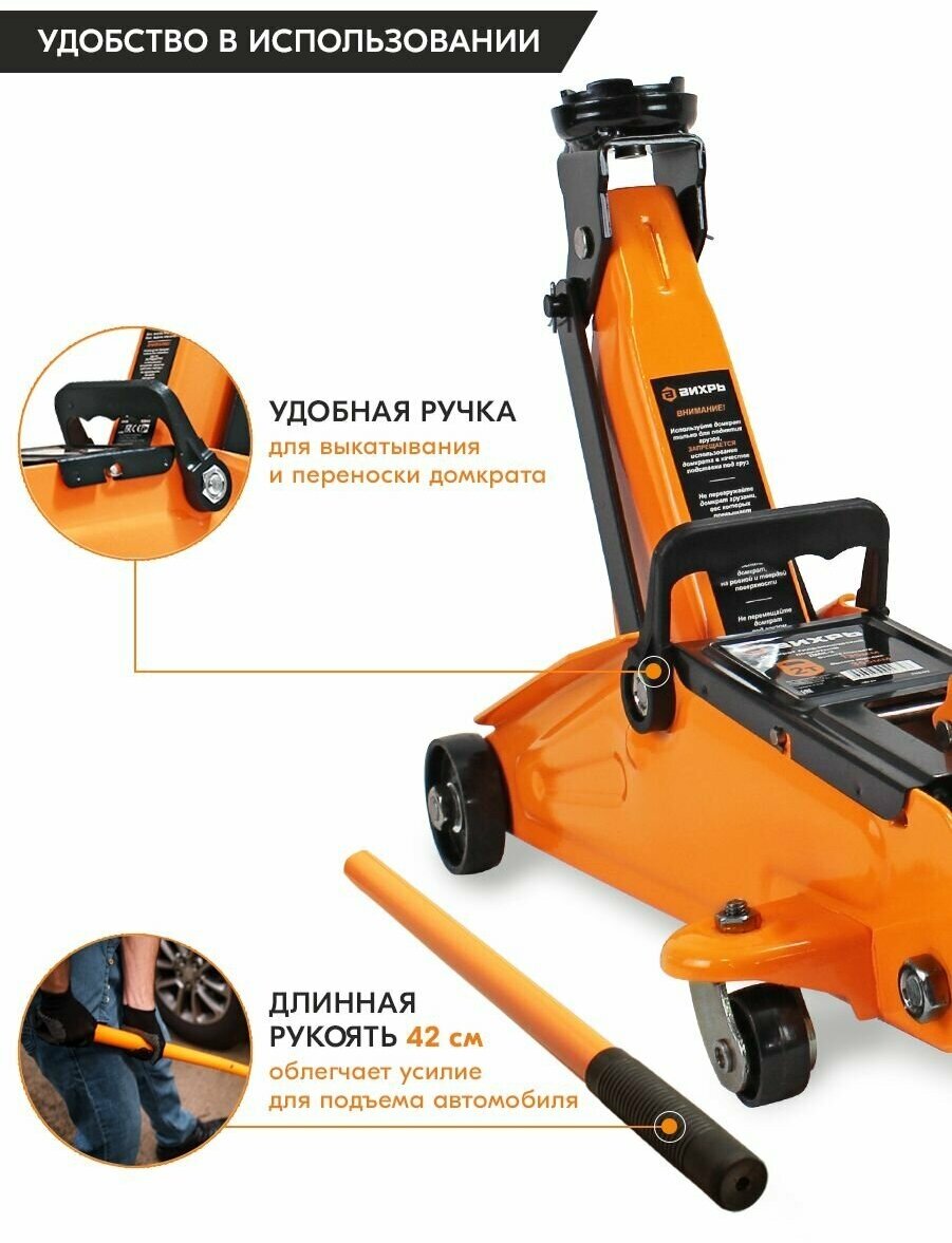 Домкрат гидравлический подкатной Вихрь предназначен для поднятия автомобилей при шиномонтаже и ремонте. В целях безопасности все домкраты Вихрь оснащены защитой от перегрузки, которая не позволяет поднимать массу, превышающую допустимый максимум.