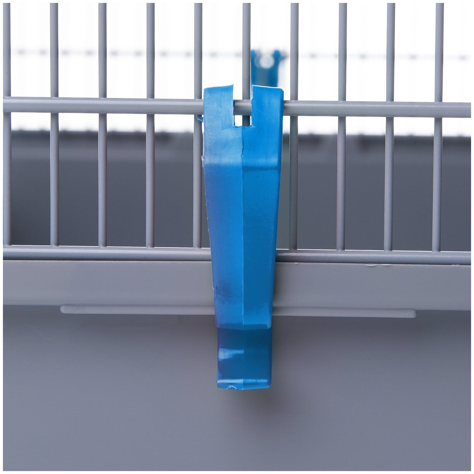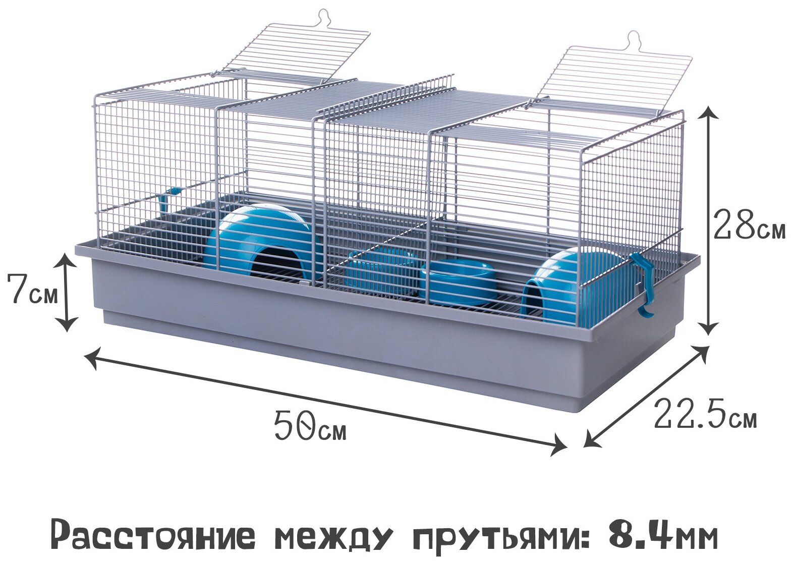 Собрать и разобрать клетку, а также ухаживать за жителями внутри сможет даже ребенок. На дно поддона на специальные упоры устанавливается общая для двух секций решетка. Это позволяет мелкому мусору проваливаться сквозь прутья, а само пространство обитания содержать в чистоте и порядке. С помощью двух пластиковых клипс быстро и без труда верхняя часть крепится к поддону. В крыше предусмотрены пара больших удобных дверок, каждая из которых находится над своей секцией, так что вы можете провести быструю уборку, досыпать корм или извлечь только одного находящегося там обитателя, при этом не потревожив покой второго.