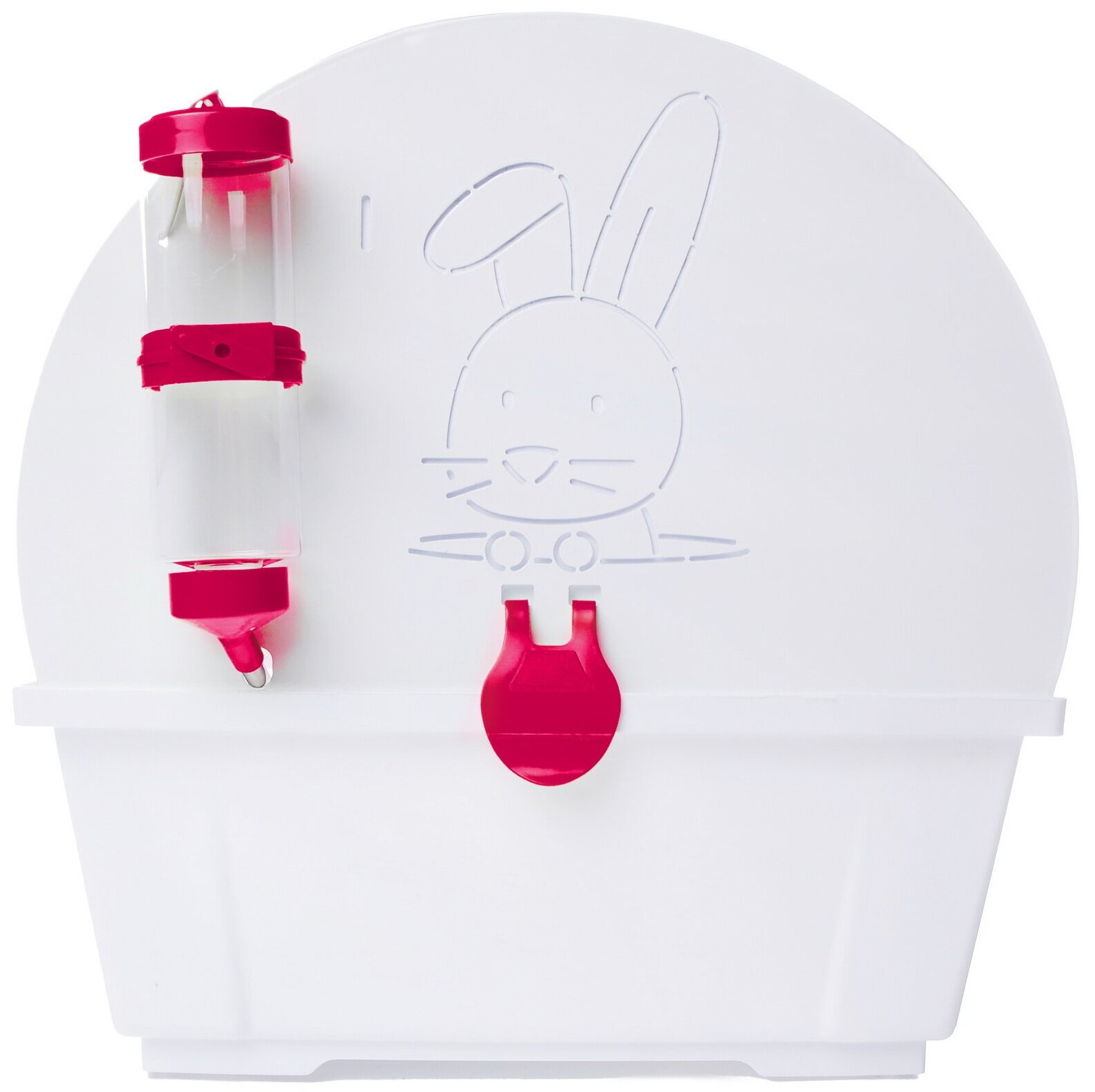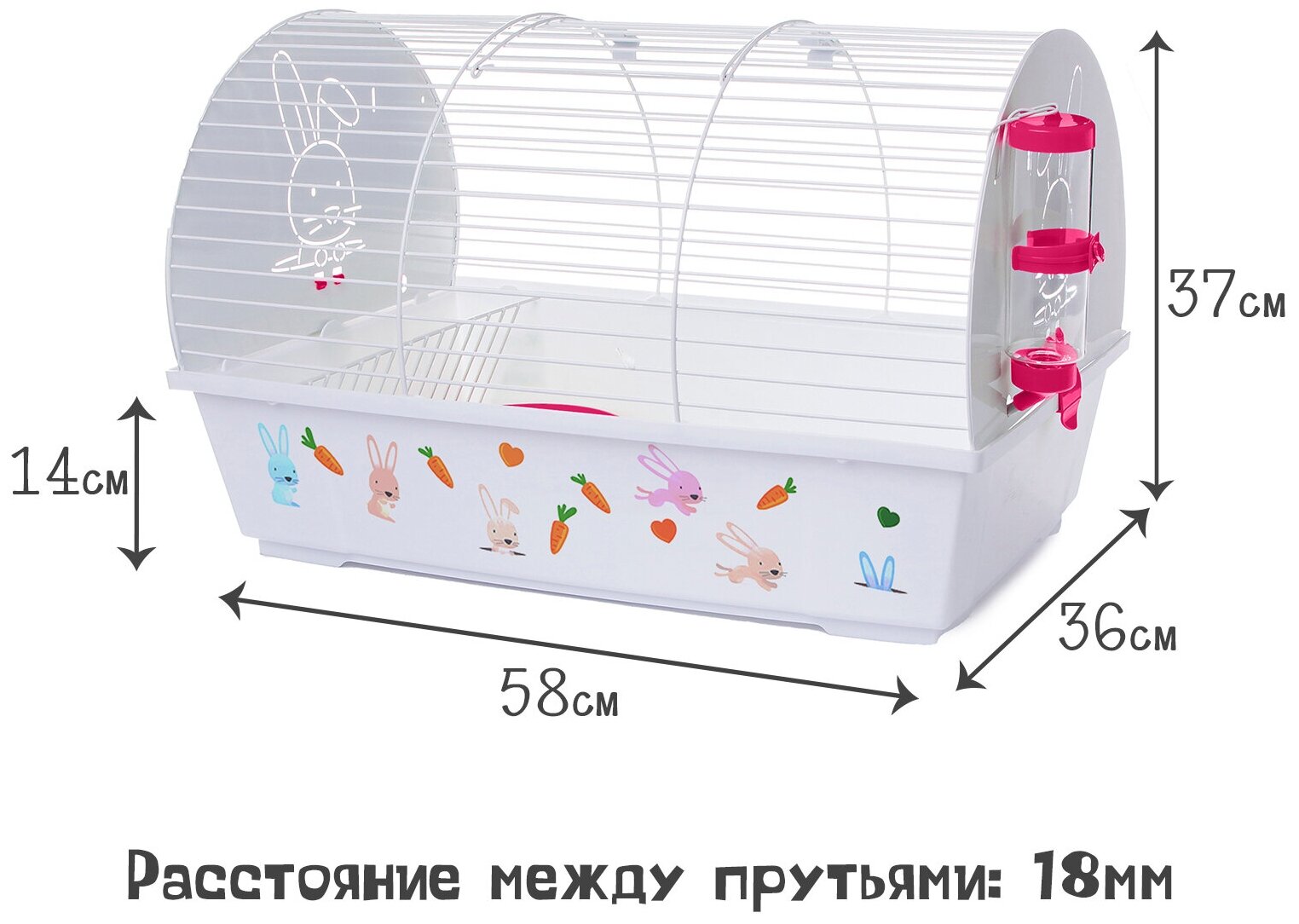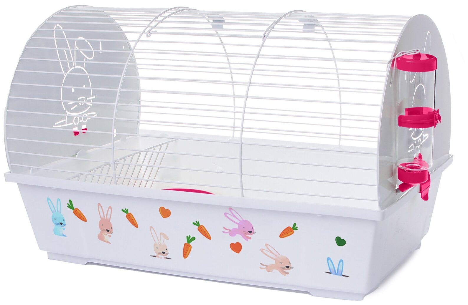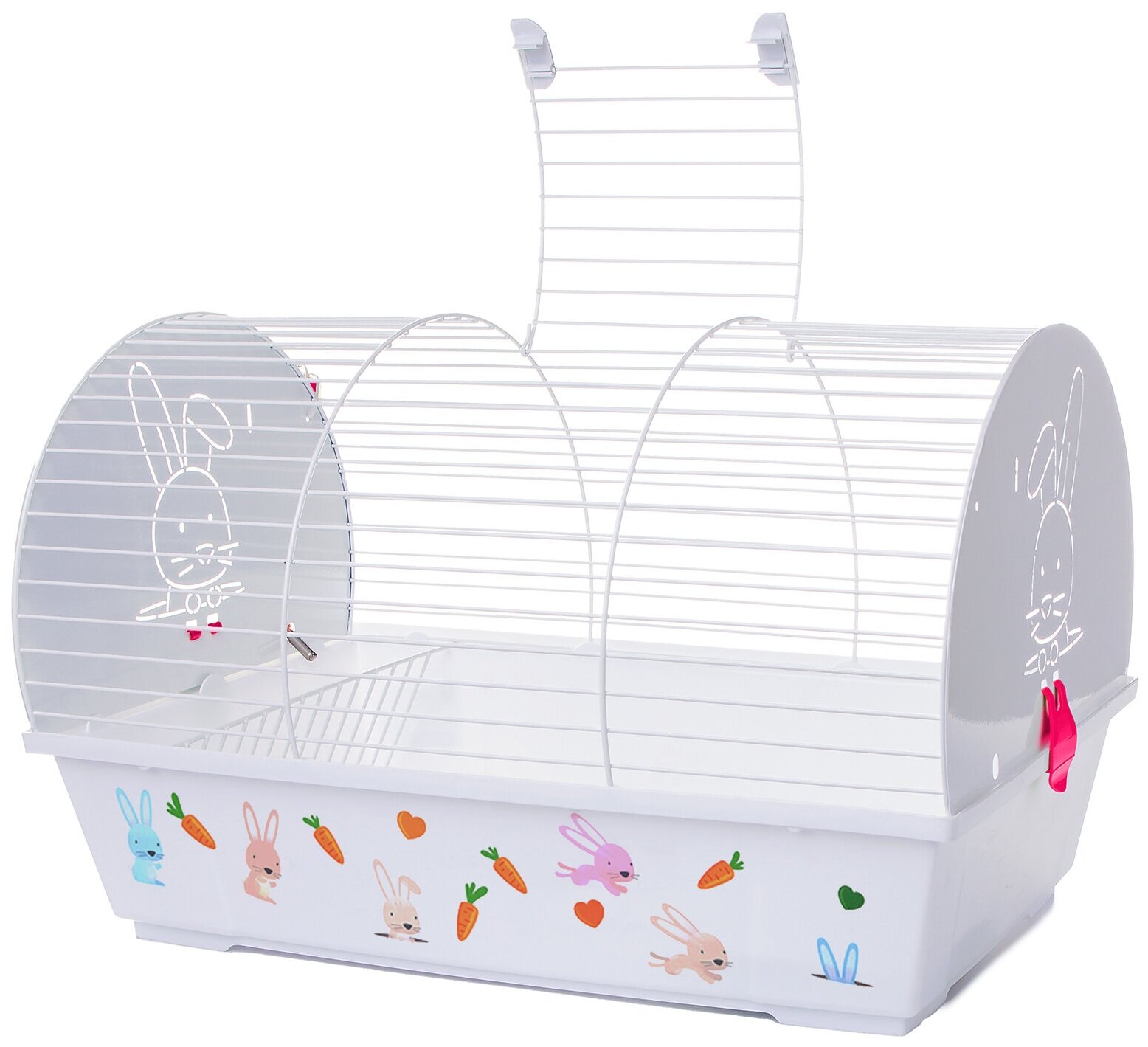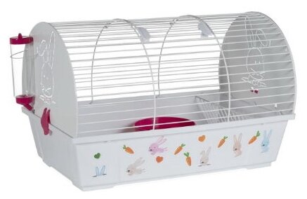 Клетка довольно компактная, но в ней помещаются все самые необходимые аксессуары для пушистика: миска для корма, решетка для сена и бутылочка-поилка с шариком в металлическом носике. Боковые стенки из тонкой стали с перфорацией в виде забавных зайчиков и высокий пластиковый поддон предотвращают разбрасывание наполнителя и мелкого мусора и создают для маленького обитателя атмосферу уюта и защищенности.
