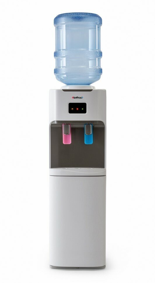 Диспенсер HotFrost V115 AE представляет собой высокопроизводительный прибор, которому под силу подогреть 5.5 л жидкости до максимальной температуры 90 градусов за 1 час. Минимальная температура охлаждения равна 10 градусам. В HotFrost V115 AE появился съемный лоток для капель, который значительно облегчит последующий уход за диспенсером. Еще одно достоинство устройства – наличие вместительного шкафчика, обеспечивающего компактное хранение чая, кофе и одноразовых стаканчиков. Бутыль с водой компактно размещается внутри диспенсера. О ходе нагрева жидкости вас проинформирует соответствующий индикатор.