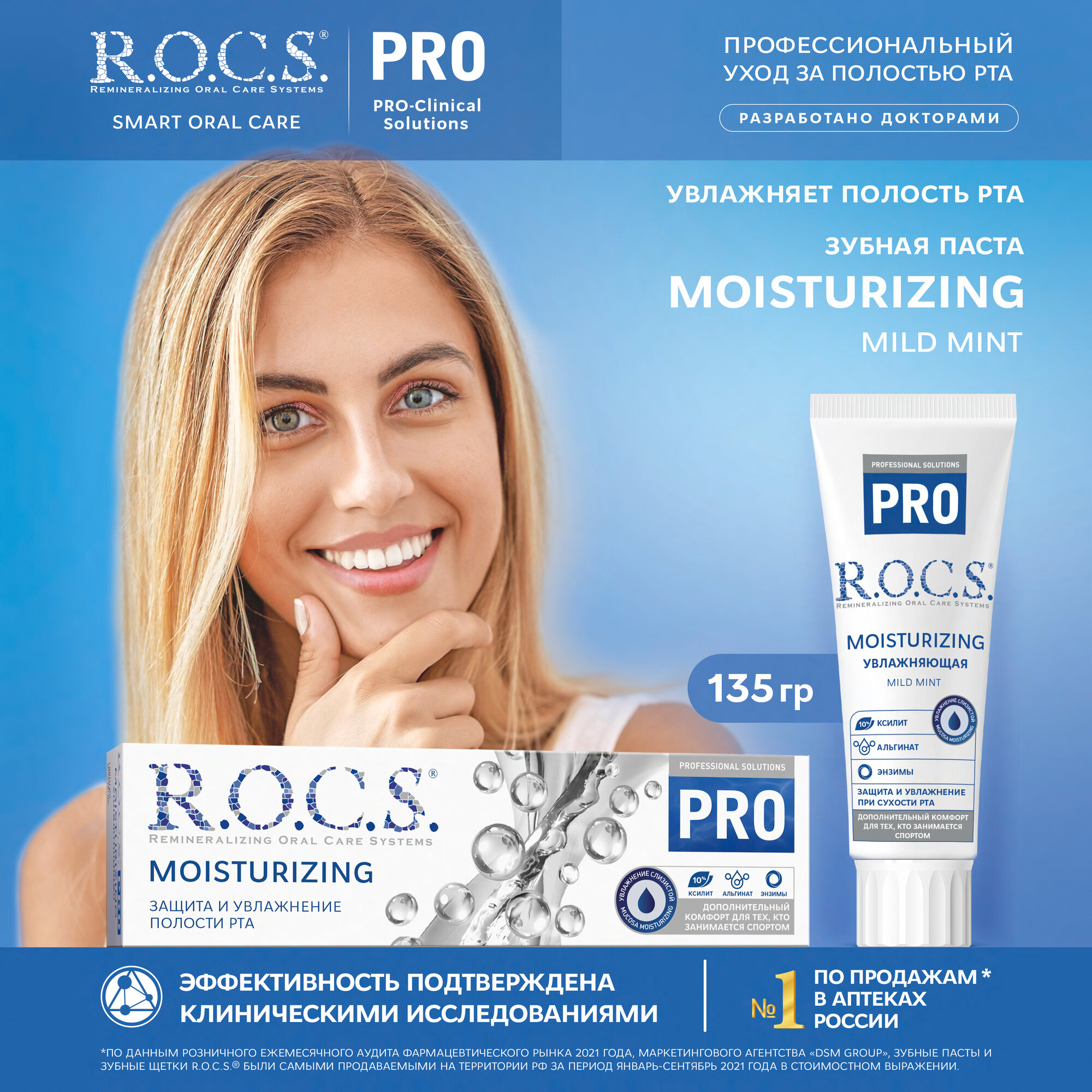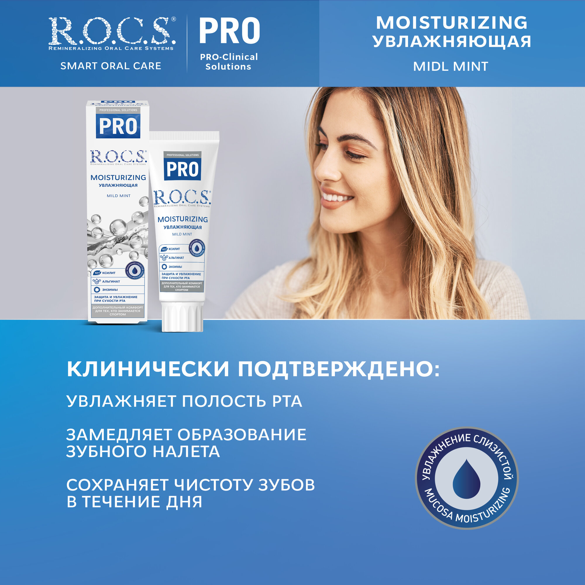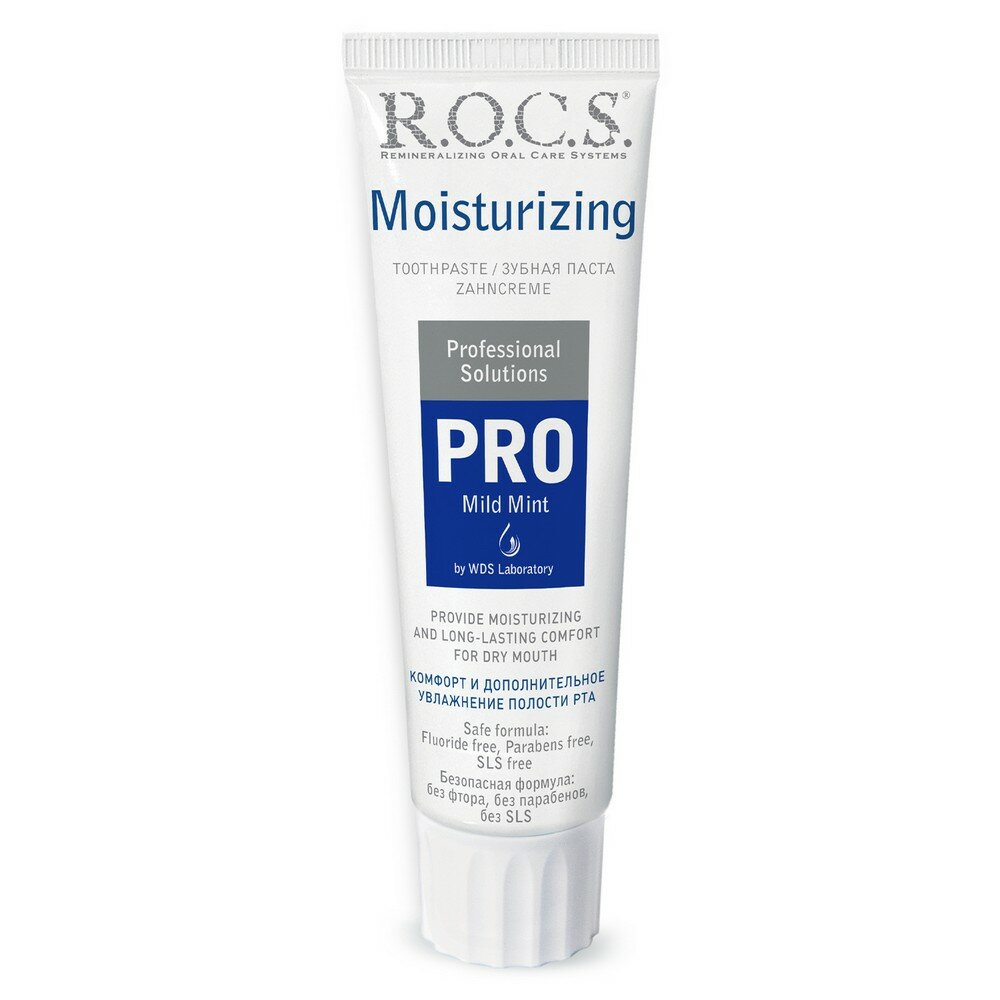 Зубная паста R.O.C.S. PRO Moisturizing "Увлажняющая" рекомендована для тех, кто хочет получить дополнительный комфорт, имеет проблему сухости в полости рта или риск ее возникновения. Разработана для защиты и поддержания увлажненности слизистой полости рта.