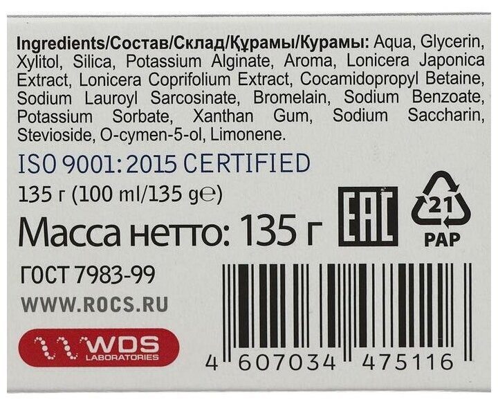 | Химический состав | Aqua, Glycerin, Xylitol, Silica, Potassium Alginate, Aroma, Lonicera Japonica Extract, Lonicera Caprifolium Extract, Cocamidopropyl Betaine, Sodium Lauroyl Sarcosinate, Bromelain, Sodium Benzoate, Potassium Sorbate, Xanthan Gum, Sodium Saccharin, Stevioside, O-cymen-5-ol, Limone |