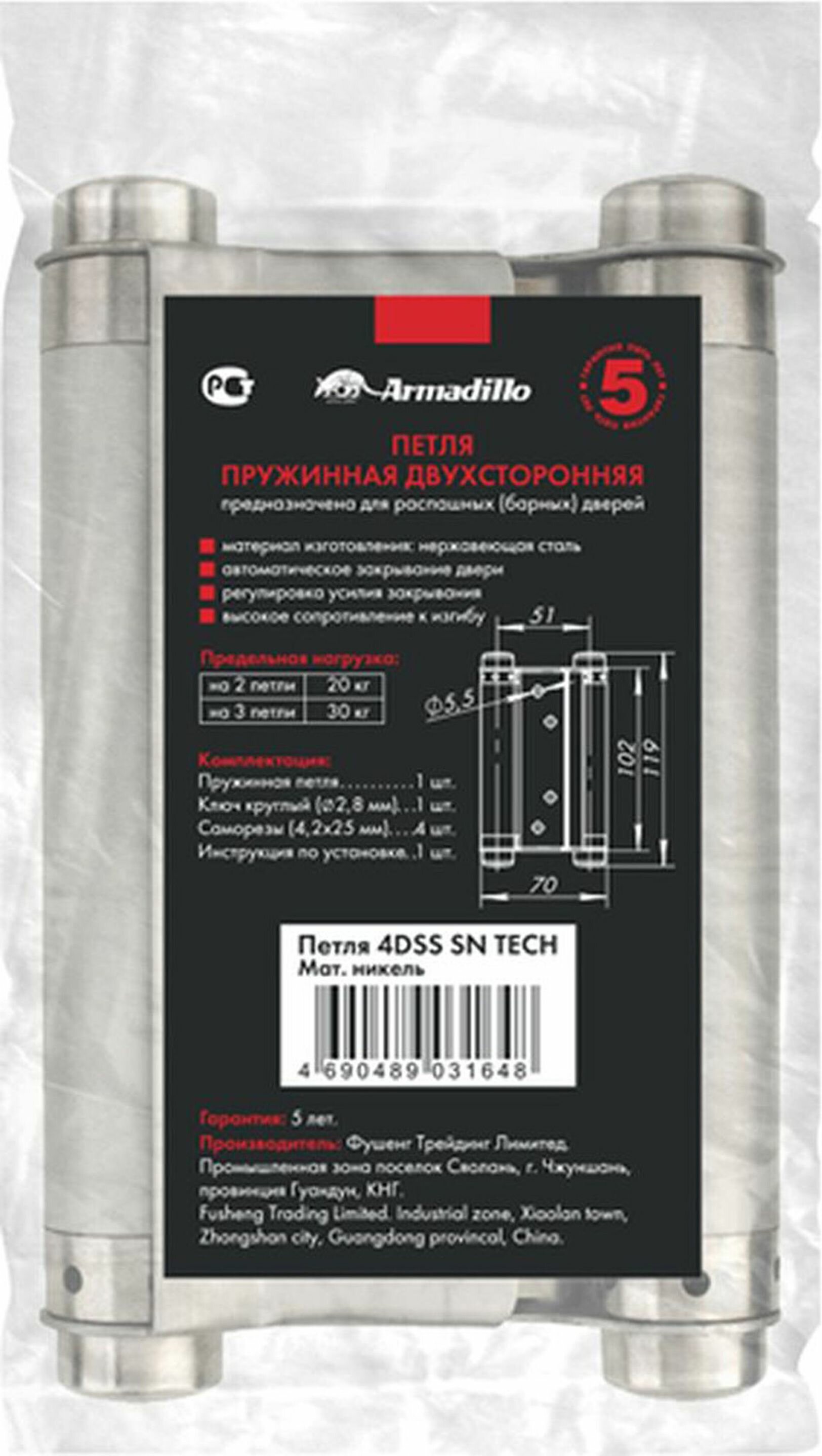 Петля пружинная 4DSS матовый никель 100х70 мм Armadillo